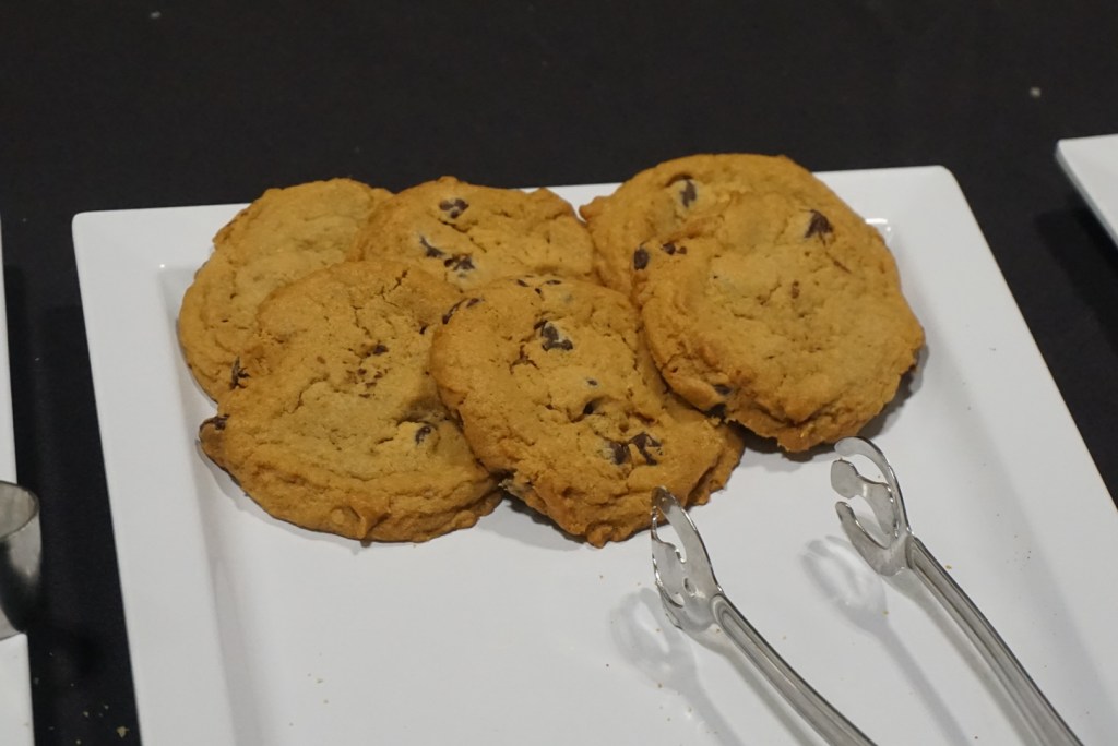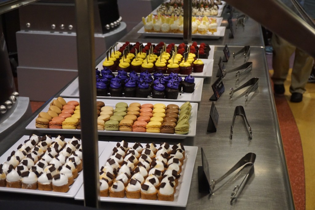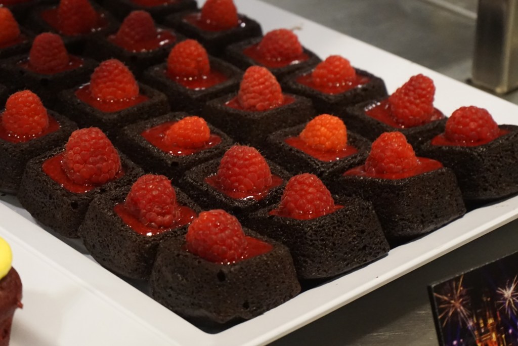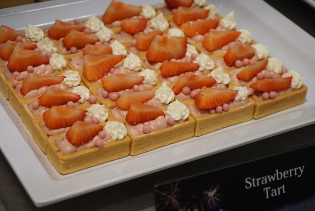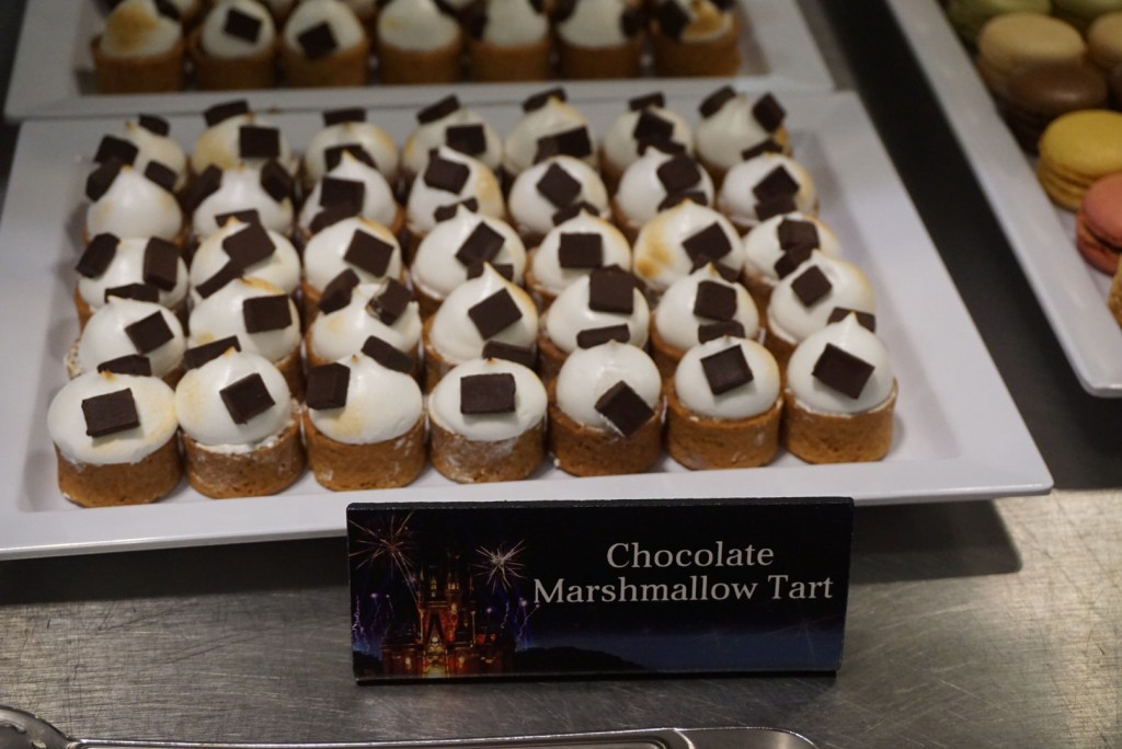 Everything on my plate was good. The cupcake was moist and very chocolatey and was topped with fluffy vanilla frosting (the purplish-blue color provided no flavor) and a few mini chocolate chips that added a little more chocolate flavor. The Strawberry Tart had a nice crunchy shortbread bottom topped with strawberry-flavored cream, a small amount of whipped cream, strawberry pearls, and a strawberry slice. The strawberry covered in dark chocolate was ripe and juicy. The other fruit and cheese were good and made for a nice balance of flavors to the sweeter treats I chose. And that just leaves my favorites. Coming in second was the s’more-like Chocolate Marshmallow Tart with its graham cracker crust topped with a dollop of toasted, fluffy marshmallow and then bite-size pieces of chocolate. If you are a fan of s’mores then this should be a winner for you.