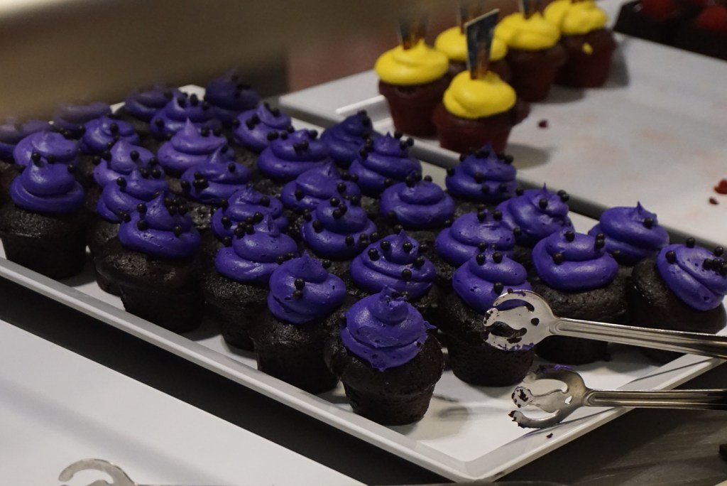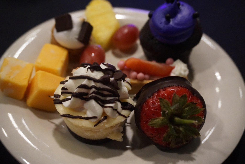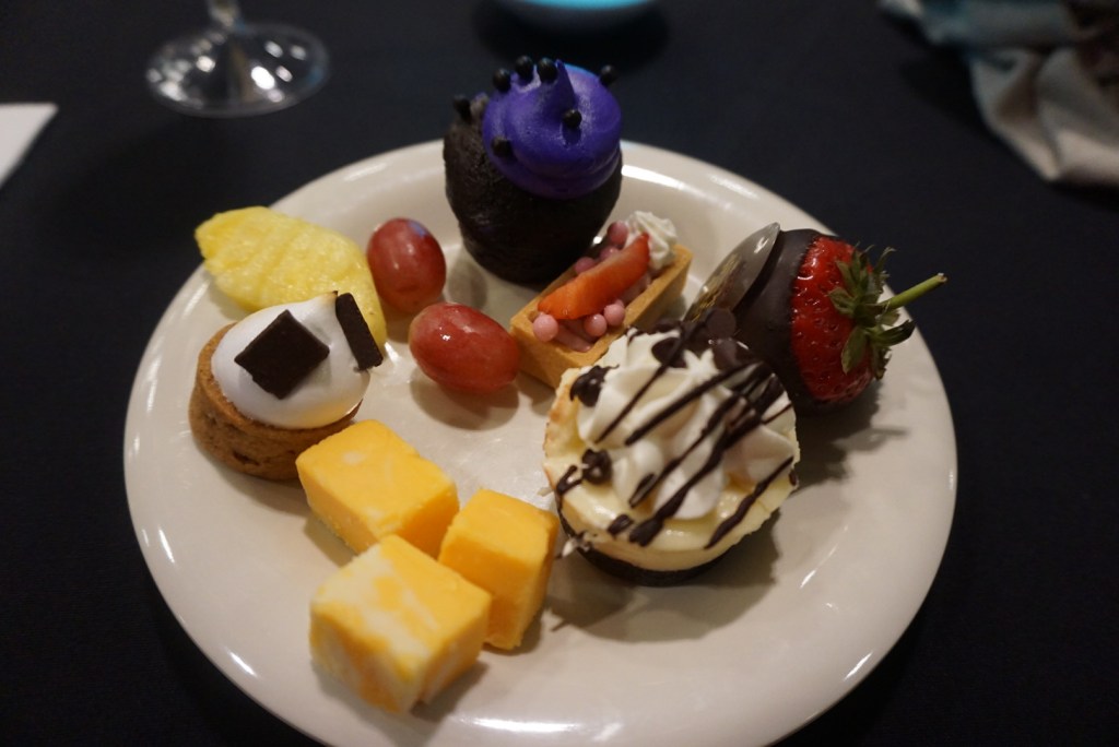 Then my food choices were (starting at the 12:00 position on my plate) a Villains Chocolate Cupcake, Strawberry Tart, Dark Chocolate-covered Strawberry, Cheesecake Brownie Bite, a few Cheese Cubes, Chocolate Marshmallow Tart, a slice of pineapple and a few grapes.