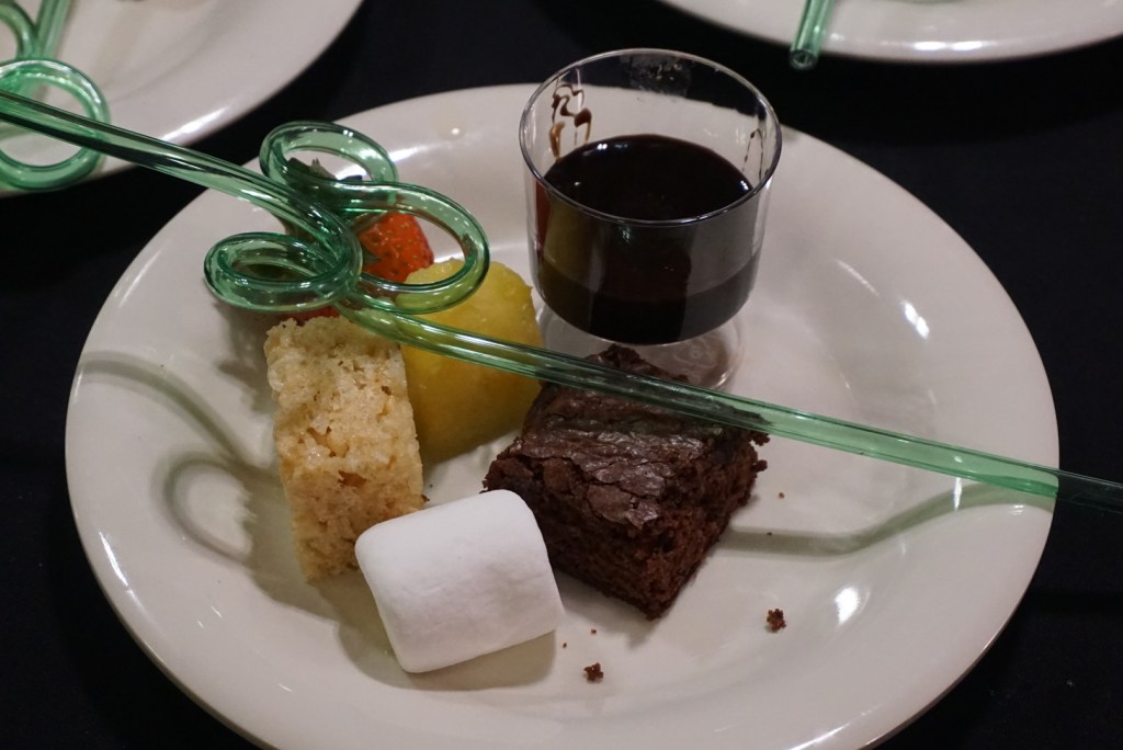 Each plate had a strawberry, pineapple, rice krispie treat, marshmallow and brownie along with warm chocolate sauce for dipping. Oh, and a Mickey straw!