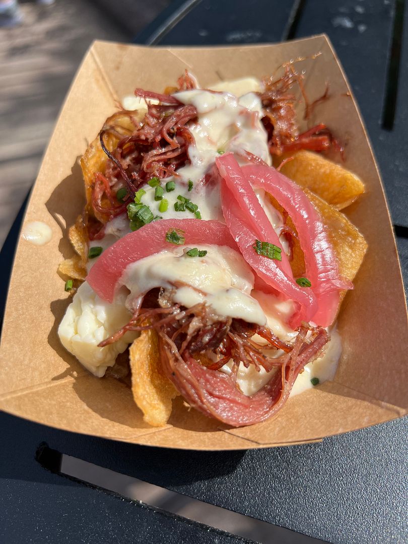 Corned Beef Corner Route: Smoked Corned Beef with Crispy Potatoes, Cheese Curds, Pickled Onions, and Beer-Cheese Fondue – $5.50