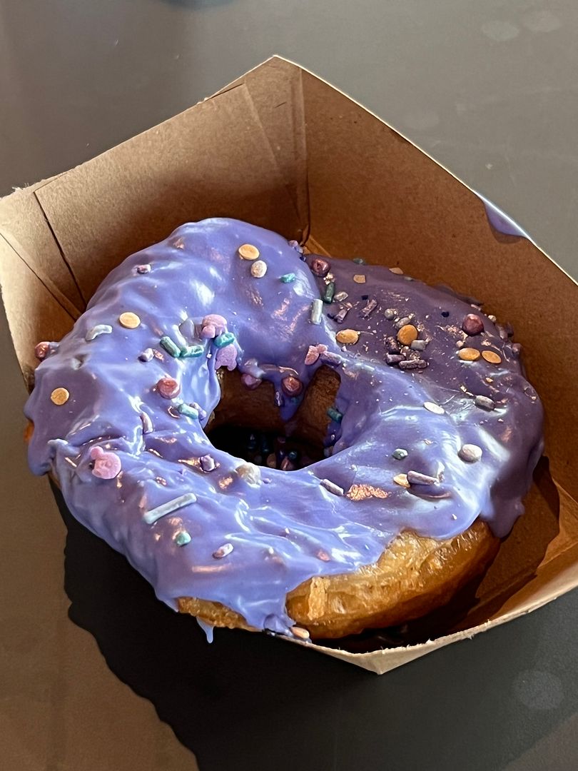 The croissant doughnut itself was pretty good but would have been better without the “plastic-like” icing/fondant. Just a light layer of icing/glaze would have been great but I guess it would not have looked pretty (“Earidescent”) that way. So anyway, based on taste only we gave this a rating of 3.