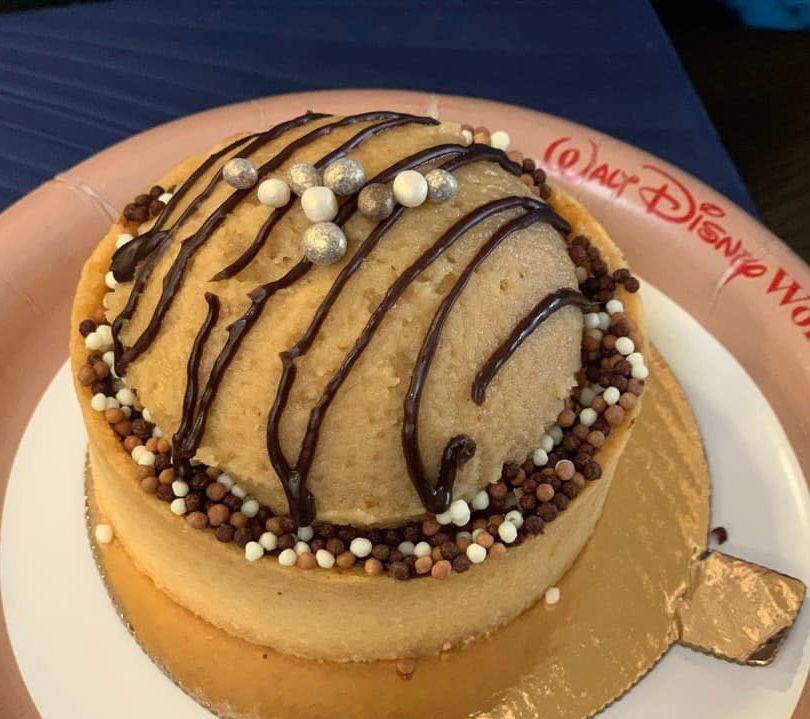 This was vanilla cheesecake with caramel sauce topped with chocolate stripes, whipped cream and a chocolate Mickey face.