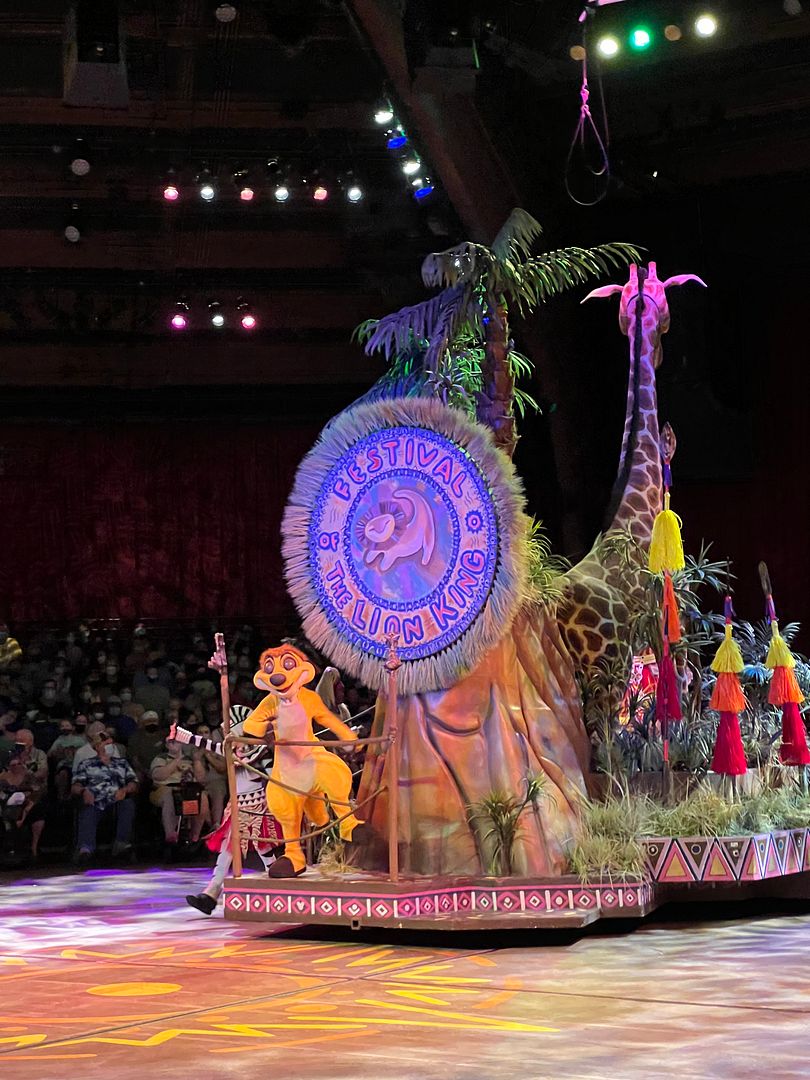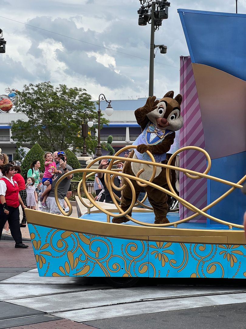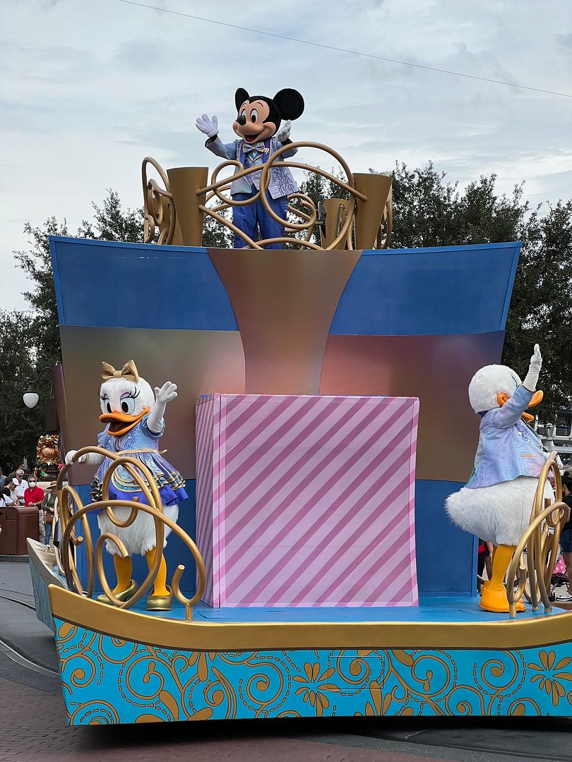 Then it was time for the 2:15 parade (I think this was the 3rd time of the 5 times that it ran daily then). This was actually the Mickey’s Celebration Cavalcade, as the Festival of Fantasy Parade did not return after Covid until March 9, 2022. It was a very short parade (probably only lasted a couple of minutes) which featured assorted performers, along with a float with Mickey, Minnie, Pluto, Daisy, Donald and Chip and Dale (all in their “EARidescent” 50th Anniversary celebration attire). It had just debuted on October 1, 2021 and ran until the 50th celebration ended on March 31, 2023.