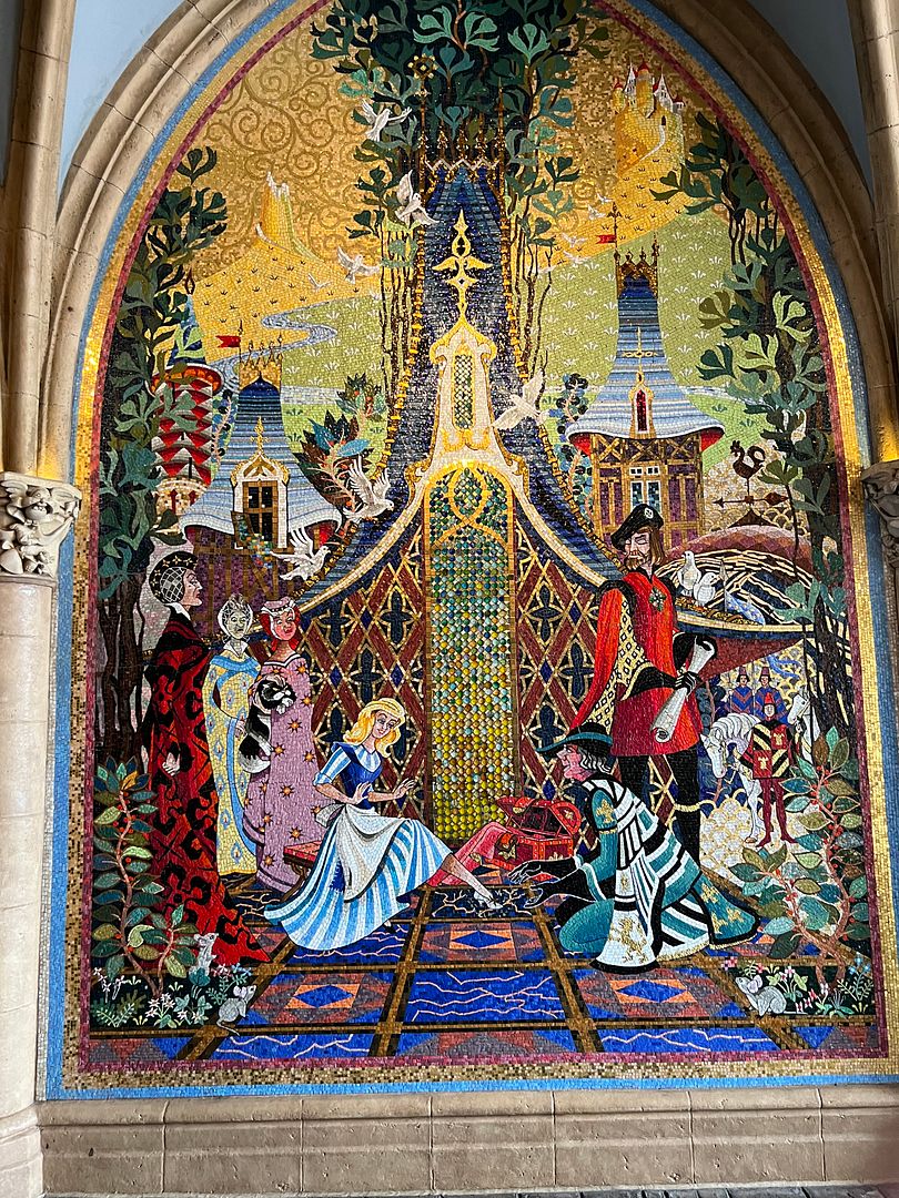 After leaving the restaurant we had to take a moment to look at the five mosaic murals that line the wall along the corridor that passes through the castle. I’m sure many people rush through this hallway, in a hurry to get their ride of choice in Fantasyland. My advice is take a moment some time to stop and take a closer look at this beautiful artwork which depicts scenes from Cinderella.