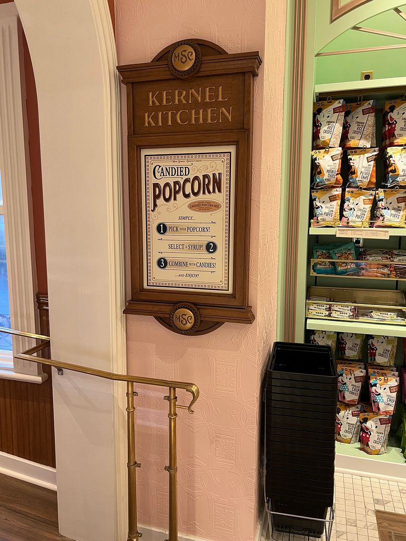 We went inside the Main Street Confectionary to kill some time. I was surprised to find the Kernel Kitchen popcorn station set up in the back of the store. I later learned that this was added when the MSC reopened after Covid in September 2021.
