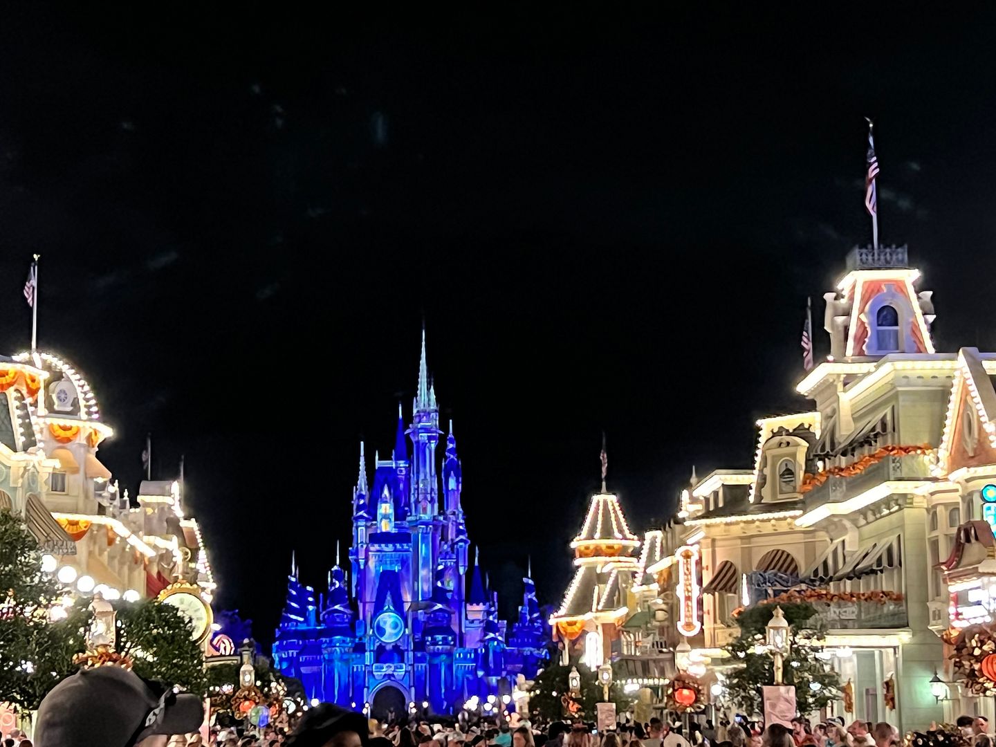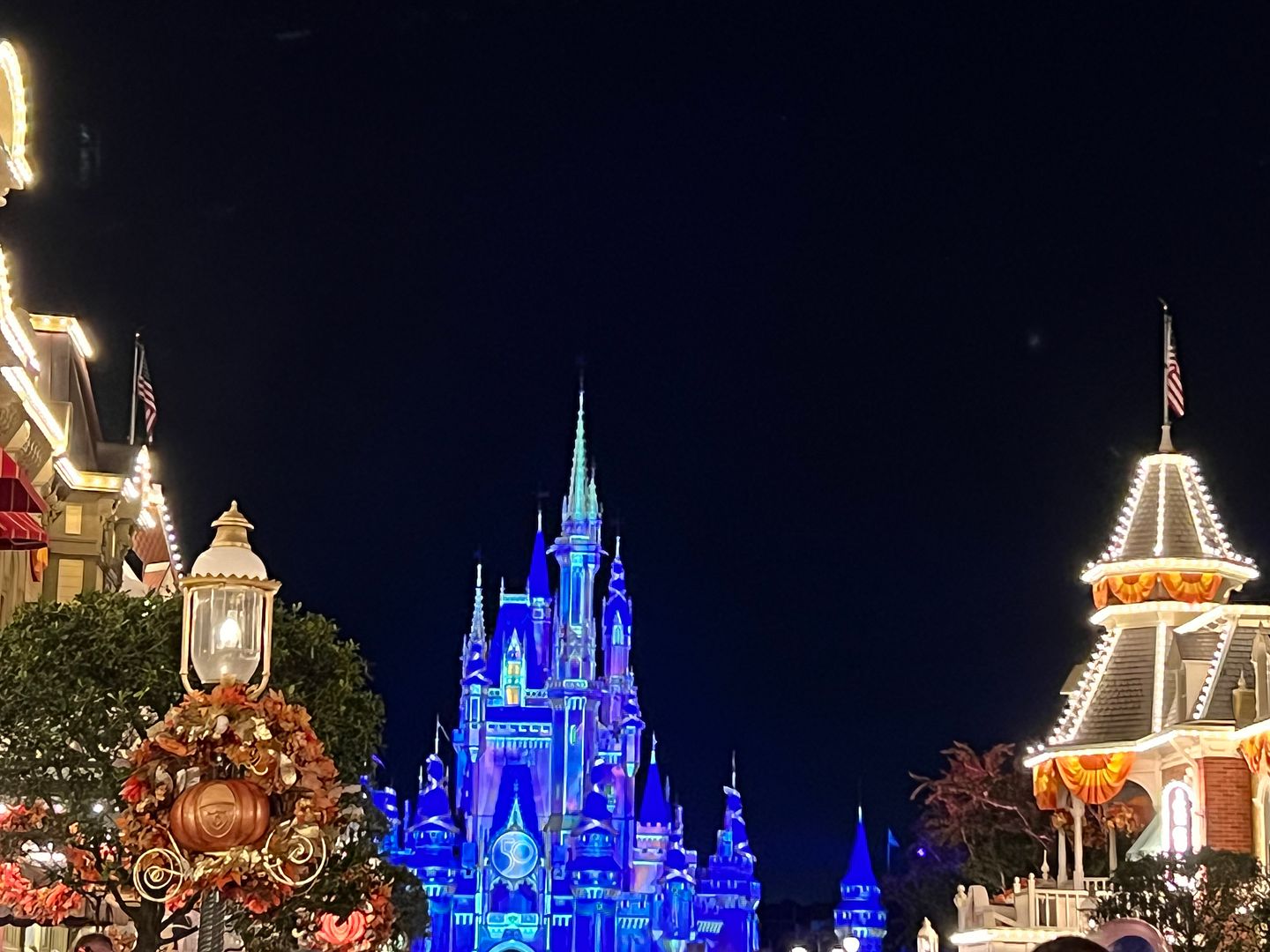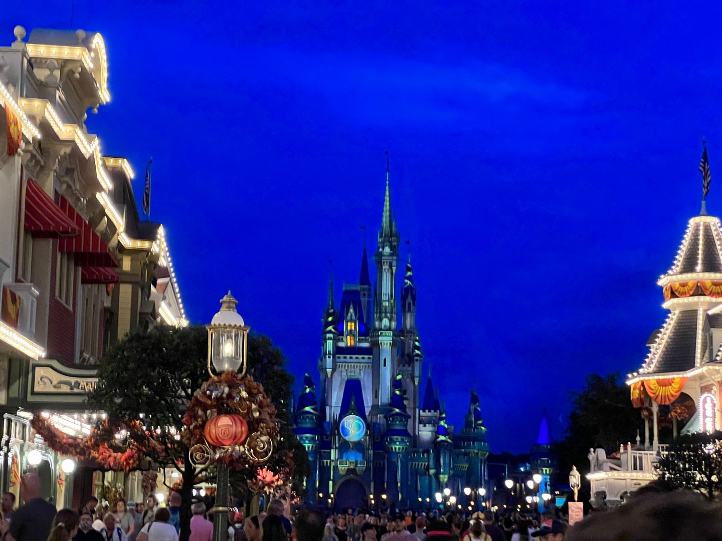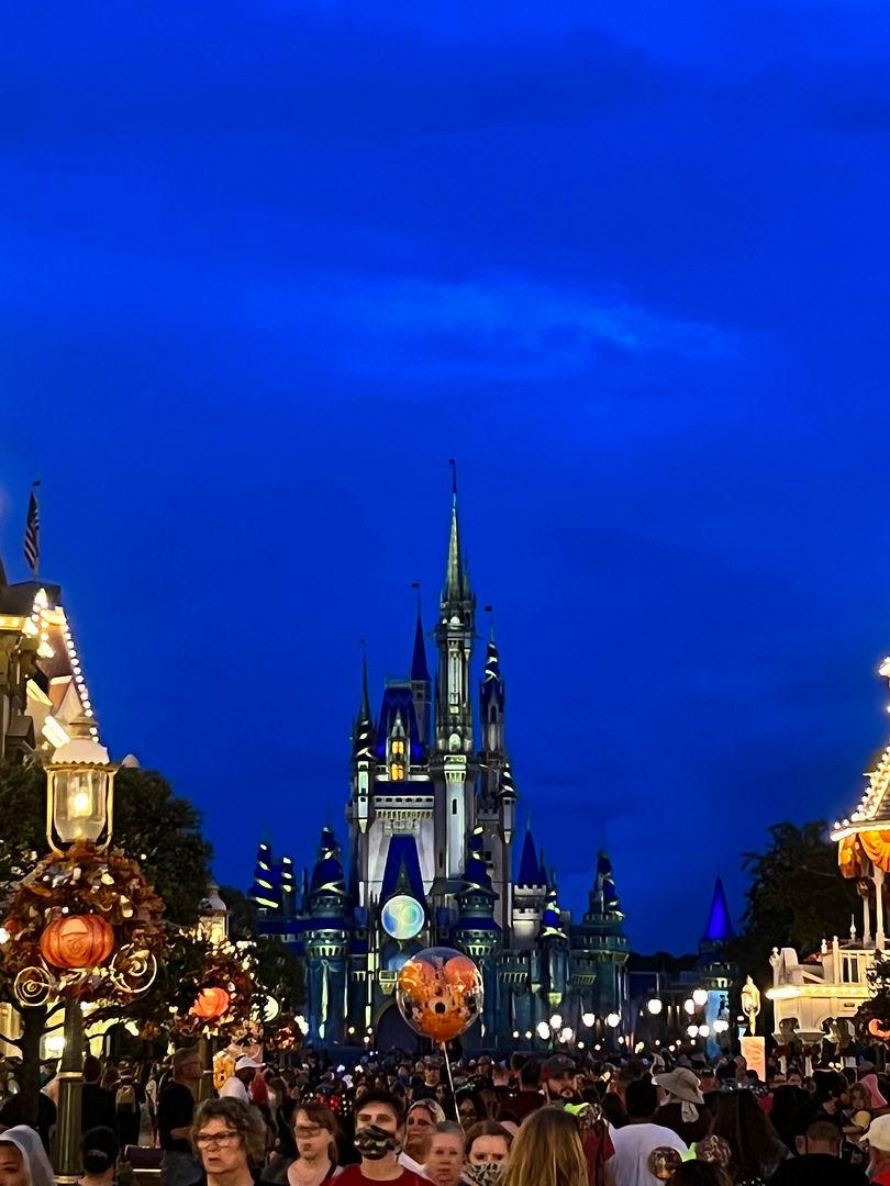 It would be hard for me to say which is more beautiful, the Halloween or Christmas decorations at Magic Kingdom. There were a few years when my annual fall trip would overlap the two and I would get to see both. As soon as the last Mickey’s Not-So-Scary Halloween Party was held, overnight Magic Kingdom would be transformed and beautifully decorated for Christmas in preparation for the first Very Merry Christmas Party. But speaking of the Halloween party, in 2020 the holiday parties were all cancelled due to Covid restrictions but in 2021 they temporarily replaced it with a scaled down version of the MNSSHP called After Hours Boo Bash. This happened to be one of the nights when this special ticketed event was being held. The tickets for this event ran anywhere between $129 (for those early parties held in August) to as high as $199 for night of Halloween. On this night (Oct. 24) they were $169. Having attended MNSSHP in the past my favorite things about it were the Boo to You Parade and Hallowishes (the Halloween-themed fireworks show). Since the Boo Bash did not have the full parade (only some calvacades) and no fireworks I didn’t feel it was worth spending $169 x 2 for tickets.
