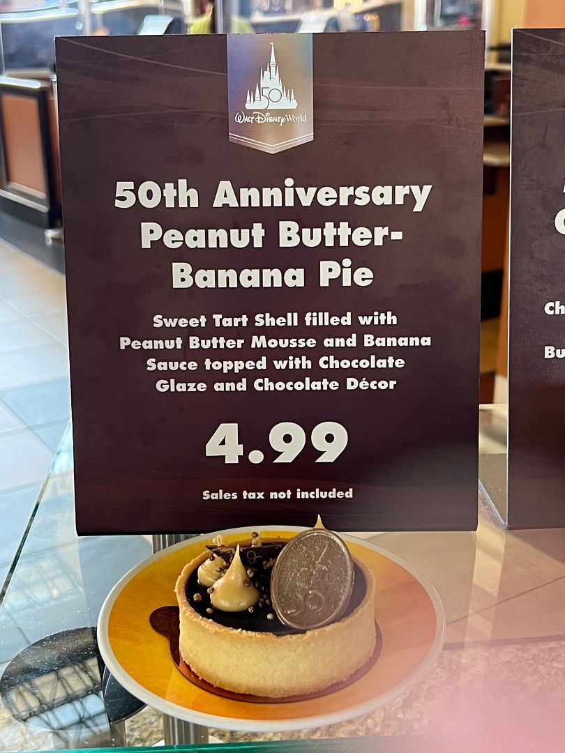 The original peanut butter pie did not have banana sauce. However, to be honest, I didn’t taste banana at all in the new anniversary version. Also, the texture of the peanut butter mousse filling was more like cheesecake. I think the original pie had cream cheese in the filling too. So in other words, the anniversary pie tasted pretty much the same as the original, just with the addition of chocolate glaze and a chocolate 50th anniversary medallion. It was very good though, rating of 4.