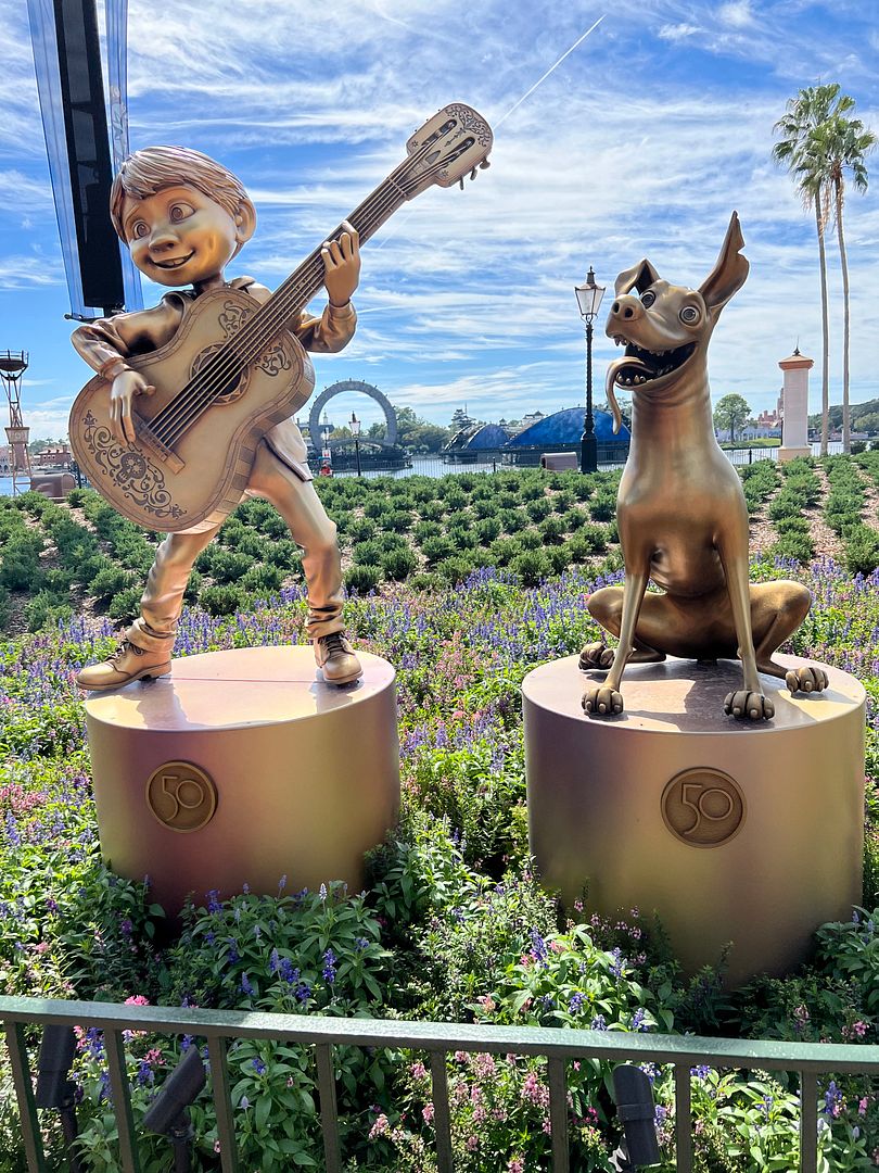 Andrew again had remote work to do this morning so we didn’t go anywhere until about 10:30 (when Epcot opened for Disney Resort guests). We really had only three goals at Epcot today. The first of these was to find Epcot’s last 50th Anniversary golden statue. During a visit to Epcot earlier in the week we had found all but Figment.