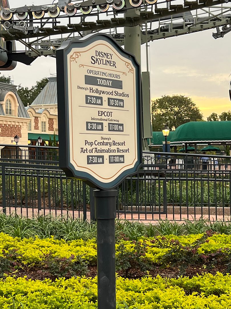 According to the posted sign, the skyliner from the Epcot station was not scheduled to begin operating that morning until 8:30. However we had boarded and were leaving Epcot by 8:28…