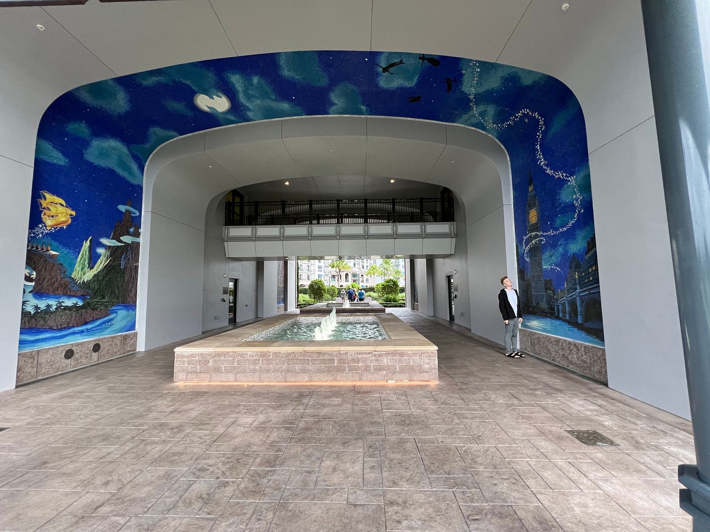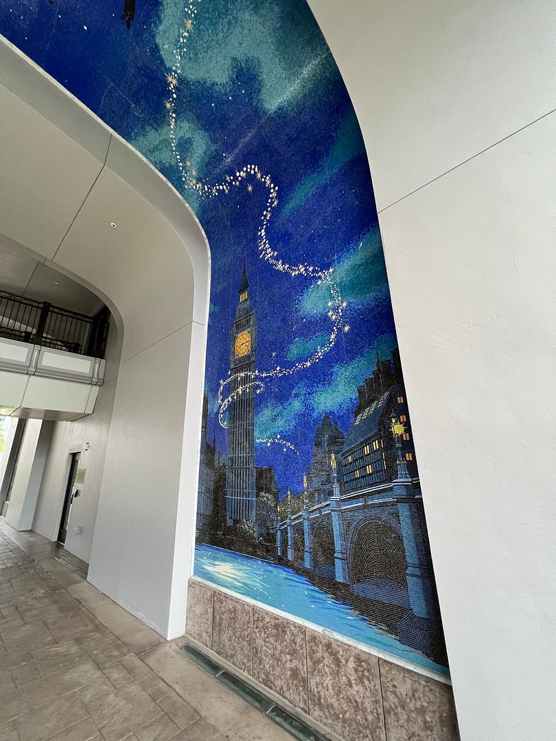 Which continues on the tunnel’s ceiling with Peter Pan, Wendy, Michael and John flying off to Never Land. Never Land and the Jolly Roger ship are then shown on the left side…