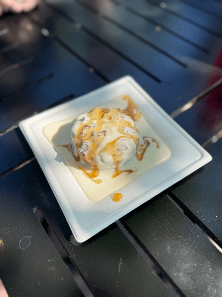This is made from pretzel bread which is topped with delicious vanilla and caramel sauces. With all the food that is available at the booths during the various Epcot festivals, it’s easy to miss this amazing snack. But my advice is, DON’T SKIP IT! It’s sweet, it’s salty, it’s delicious and it costs less than $5. What more can you ask for? Our group gave the Pretzel Bread Pudding a nearly perfect rating of 4 1/2.