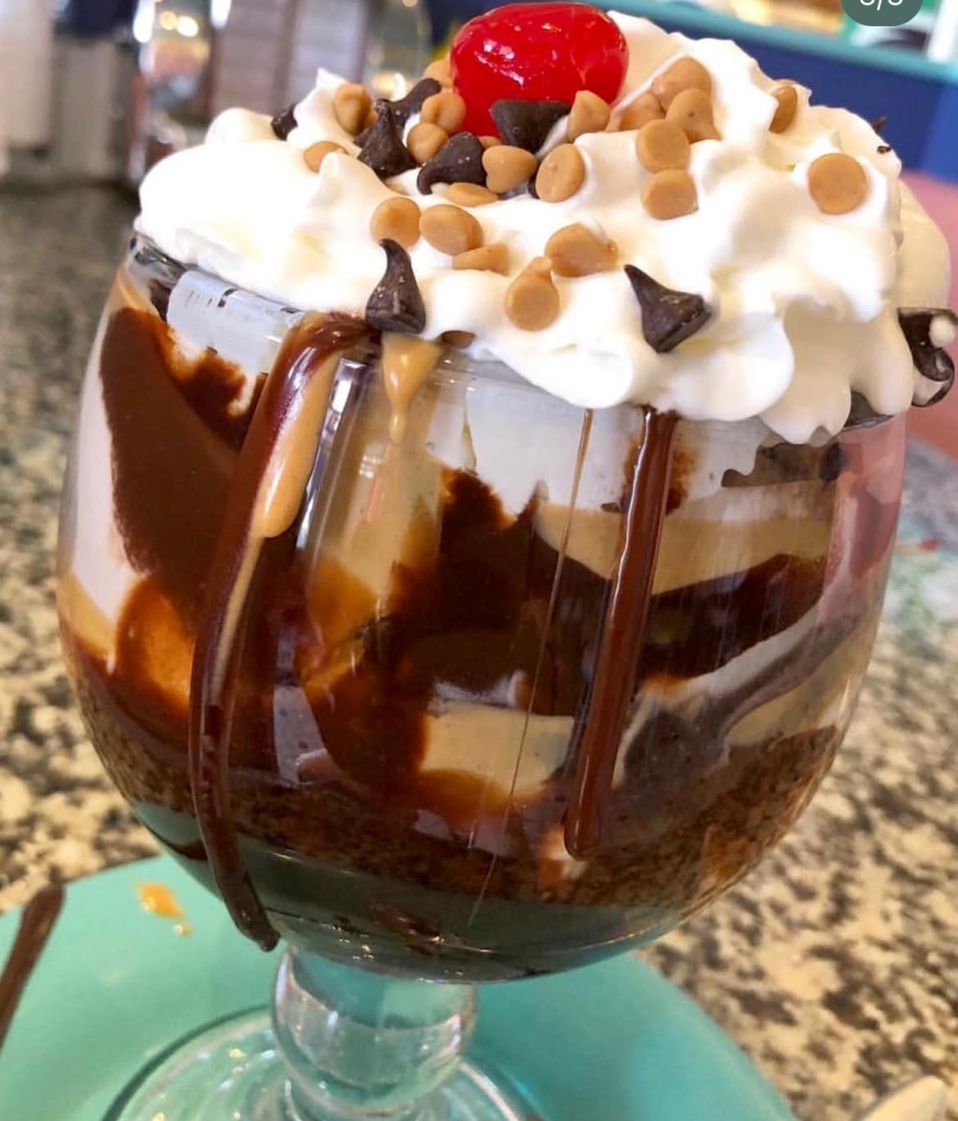 I must confess that I’ve never been hungry enough to order this full-size sundae but I’ve seen a copycat recipe for it online that calls for 4 scoops of ice cream (two vanilla, two chocolate) topped by 1/2 cup each of warm peanut butter sauce and hot fudge sauce. All of that is then thoroughly covered with a mound of whipped cream, followed by 2 tablespoons each of mini peanut butter and chocolate chips. Oh, and don’t forget the maraschino cherry on top!
