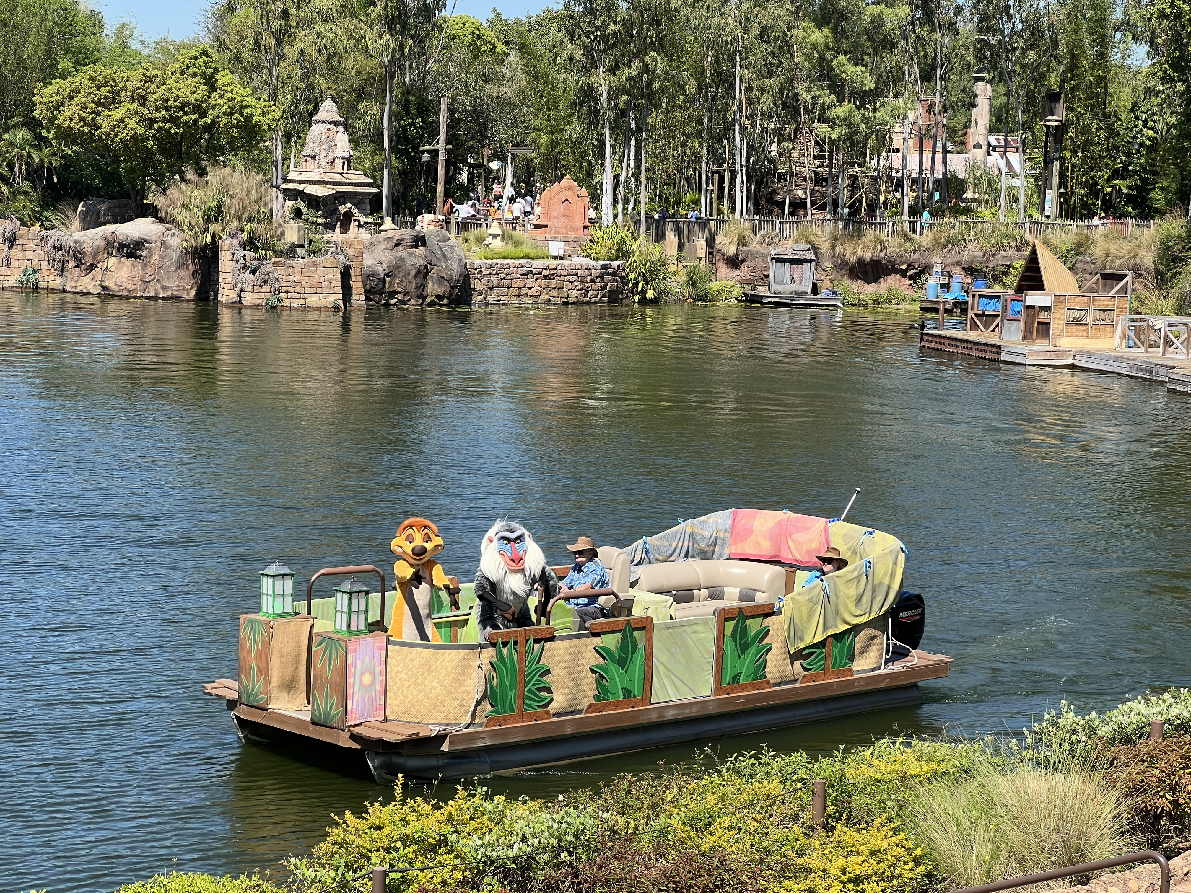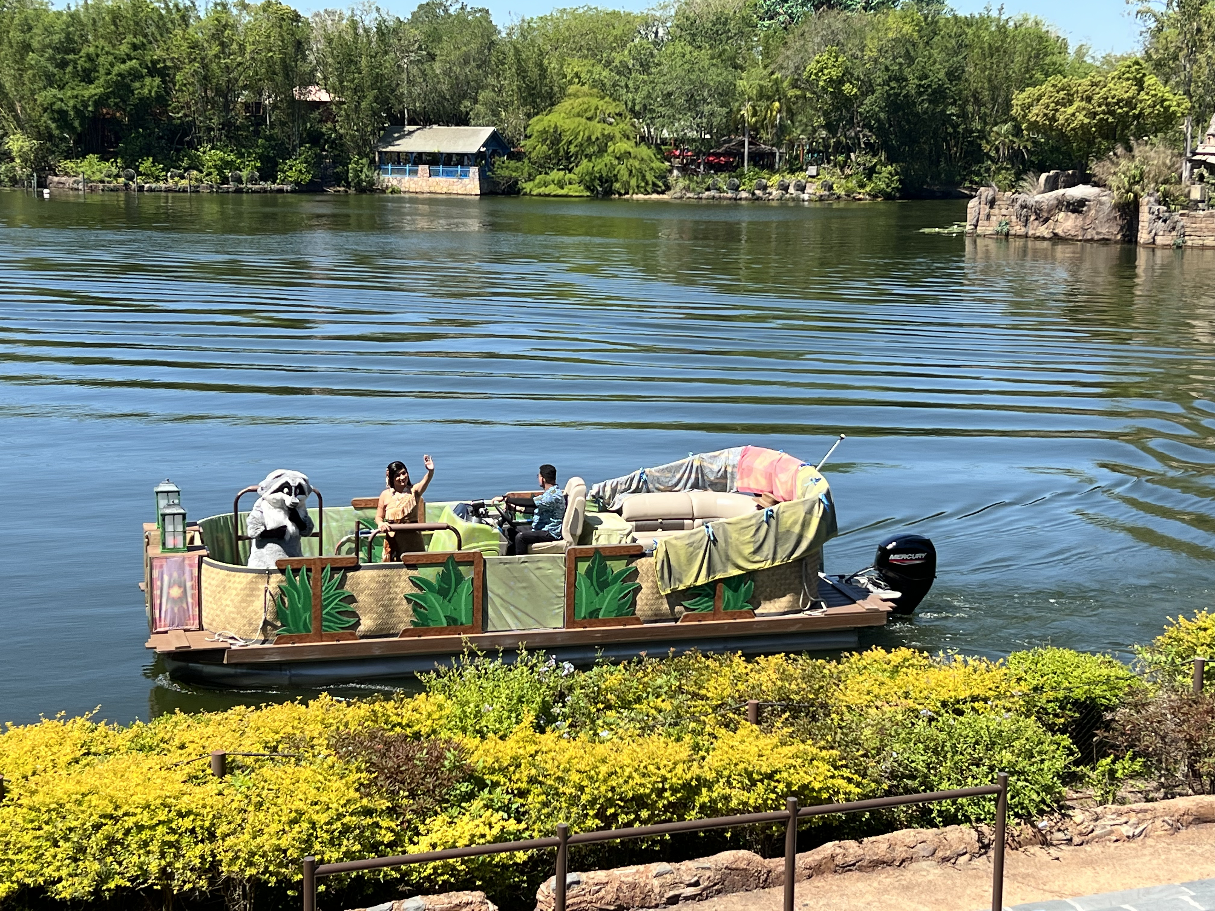 After riding Everest we had some time to kill before our lunch reservation so we decided to hang out in the stadium seats of the amphitheater across from the entrance to the ride. The theater surrounds the Discovery River lagoon and is where the Rivers of Light show used to be held. While we were hanging out there we saw several boats go by, each carrying two characters, and we had fun waving to and interacting with the characters on board. First were Timon and Rafiki…