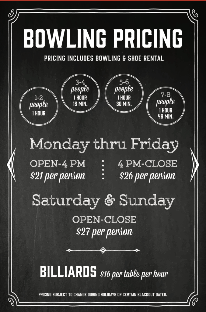 I think the regular price when we were there on a Thursday afternoon was $20 per person plus tax, which includes shoe rental. We paid about $16 each plus tax with the Cast Member discount.