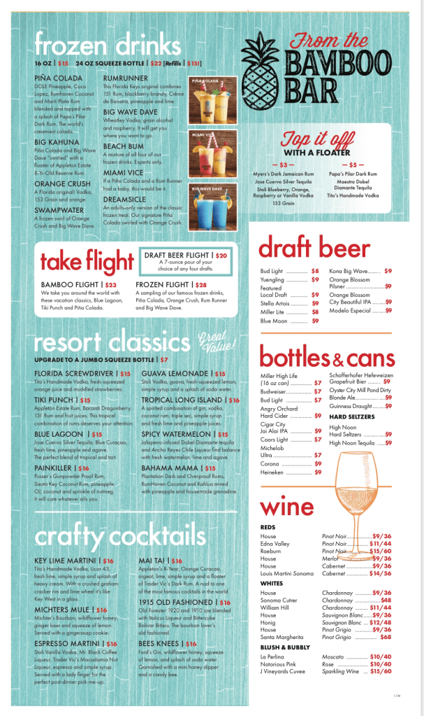 Here’s the Cocktail menu for Splitsville’s Bamboo Bar to help give you an idea of what they have to offer here…