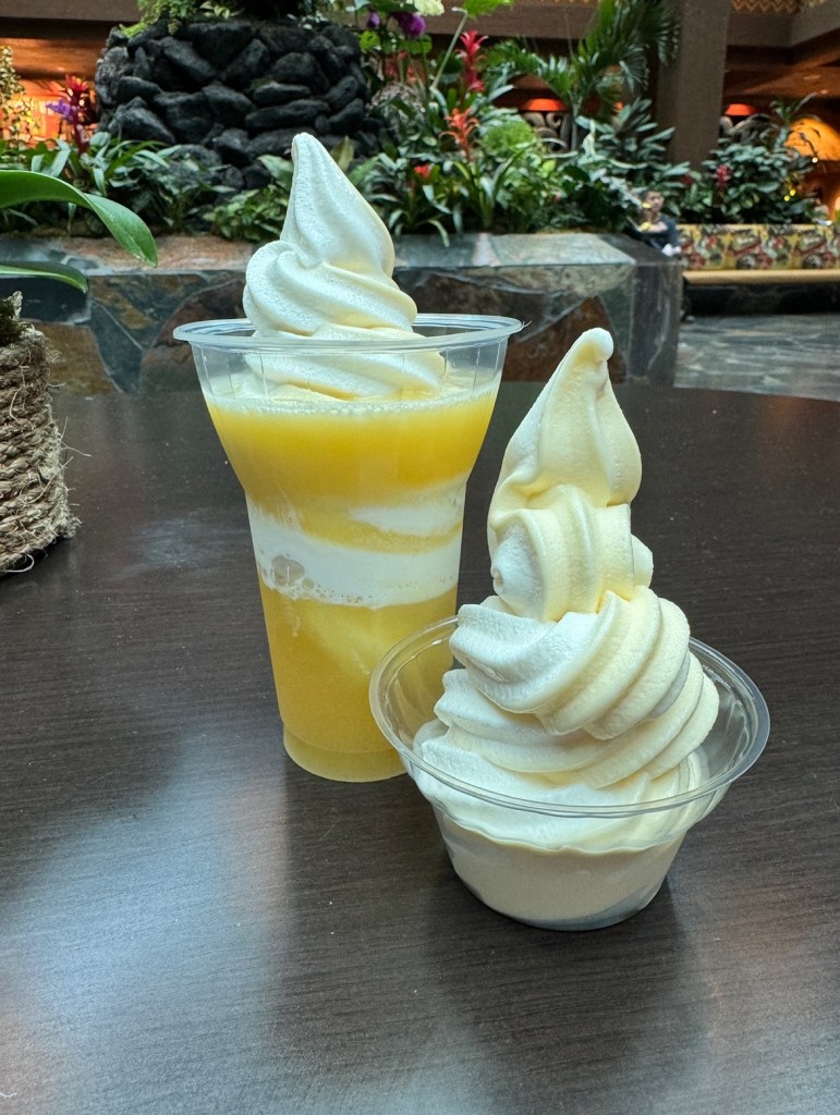 On the left is a Pineapple Float (Pineapple Juice with Pineapple and Vanilla Dole Whip Swirl) and on the right is the same swirl of Pineapple and Vanilla Dole Whip Soft-serve in a cup. I paid $5.49 (plus tax) for the Dole Whip cup and $6.29 for the Float. As of January 2025 the Dole Whip cup price has not changed but the Float now cost $6.49.