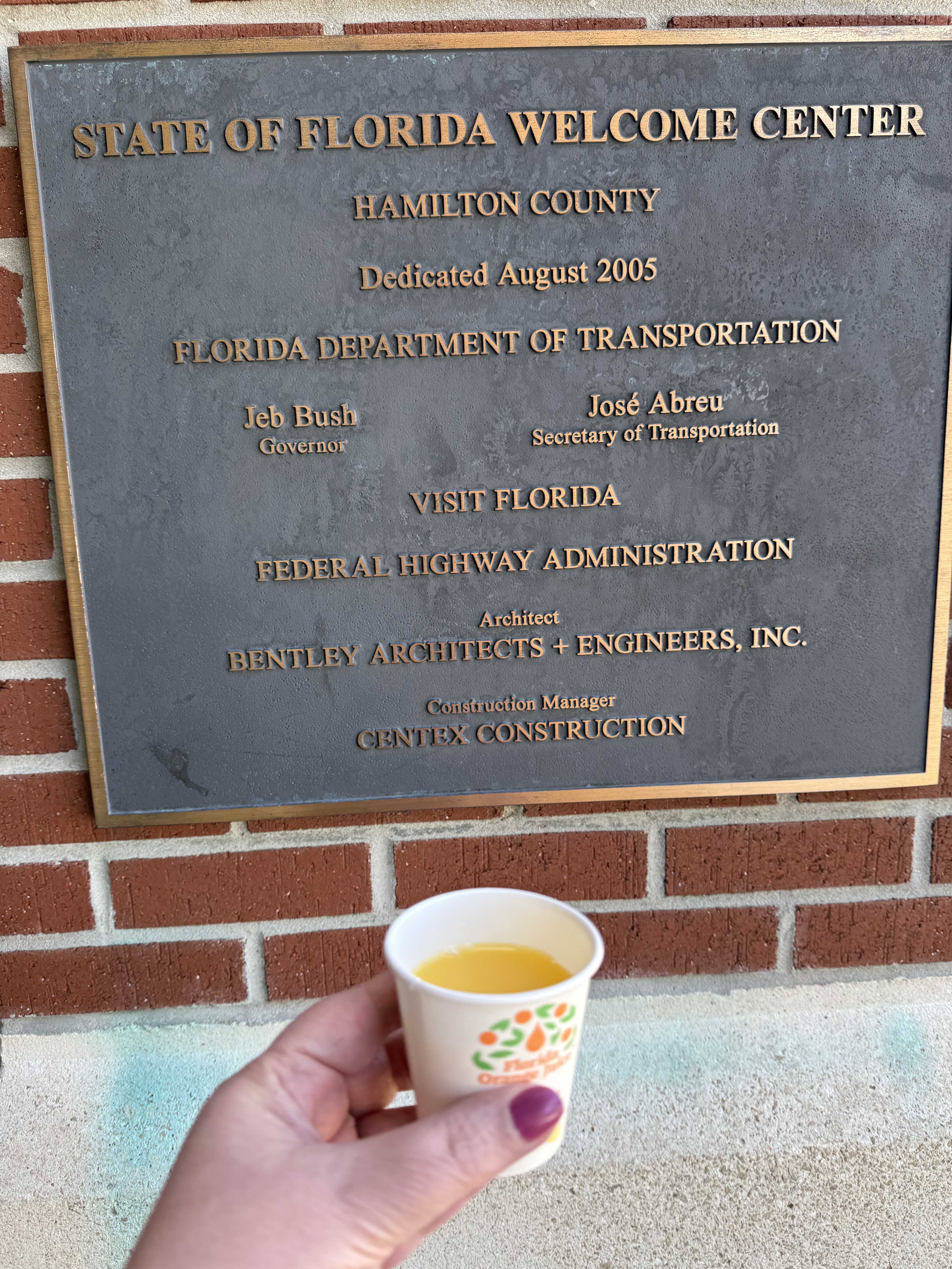 Our drive actually began on Tuesday, the 18th, but we stopped overnight just south of Atlanta. So we reached the Florida state line just before noon the next day. A little perk of driving to Florida instead of flying is that you can stop at their Welcome Center soon after entering the state on Interstate 75 South. It is here that you can get a free cup of orange juice, as long as you are there during their Operating Hours of 8:00 a.m. – 5:00 p.m.