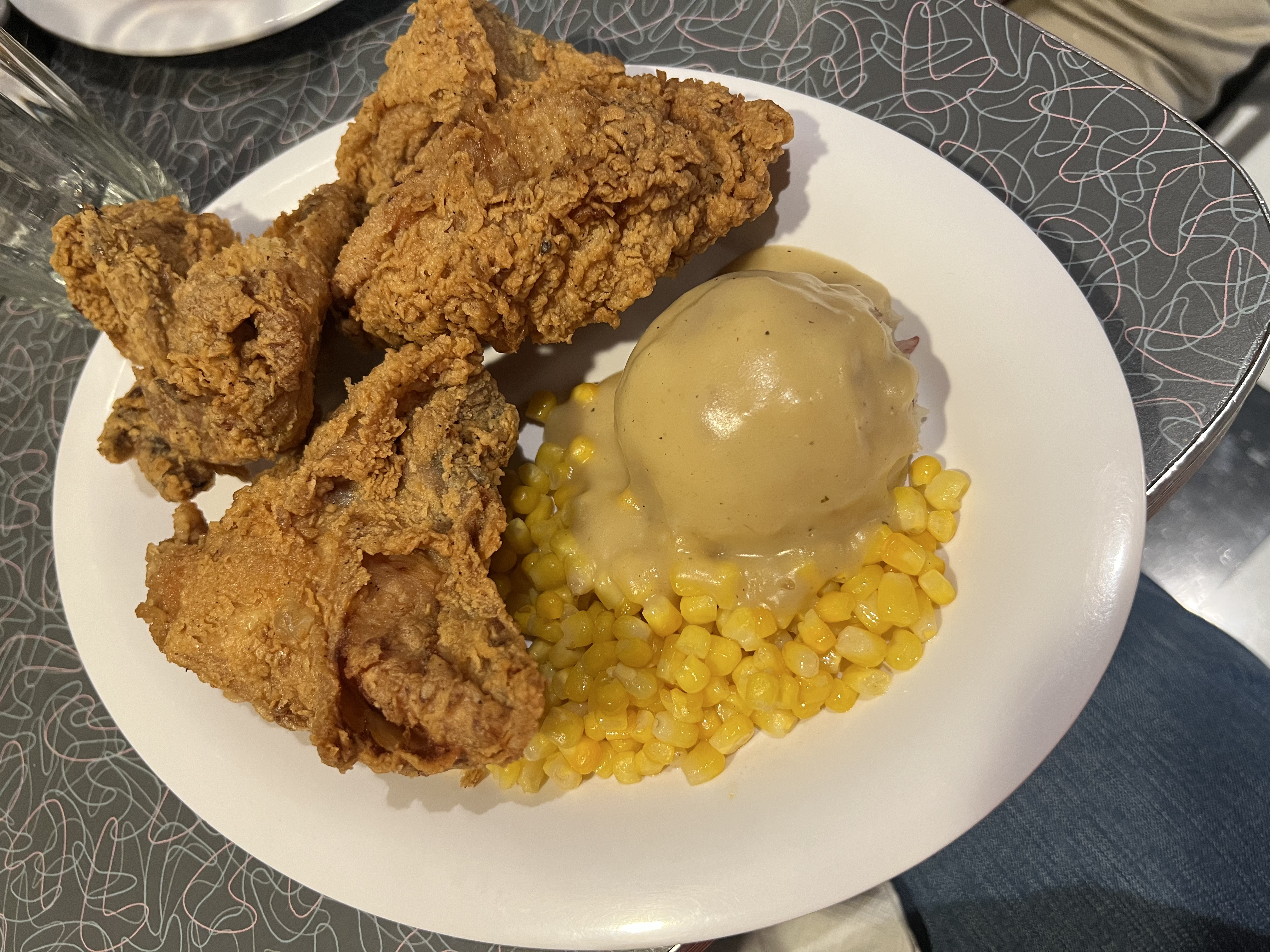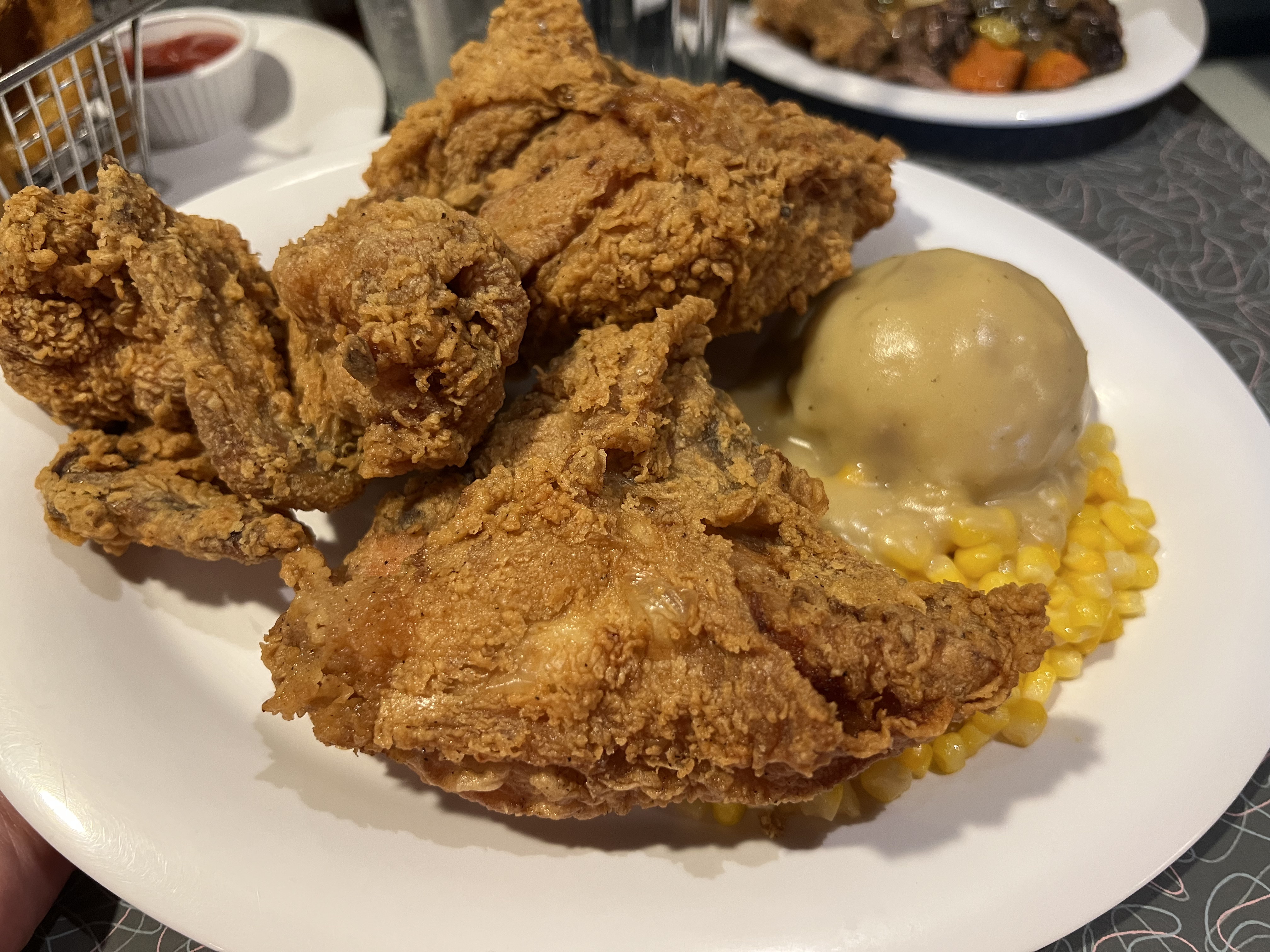 Aunt Liz’s Golden Fried Chicken served with Roasted Mashed Potatoes, Chicken Gravy and Seasonal Vegetables (Corn) – $26.00 (Price $27.00, December 2024)