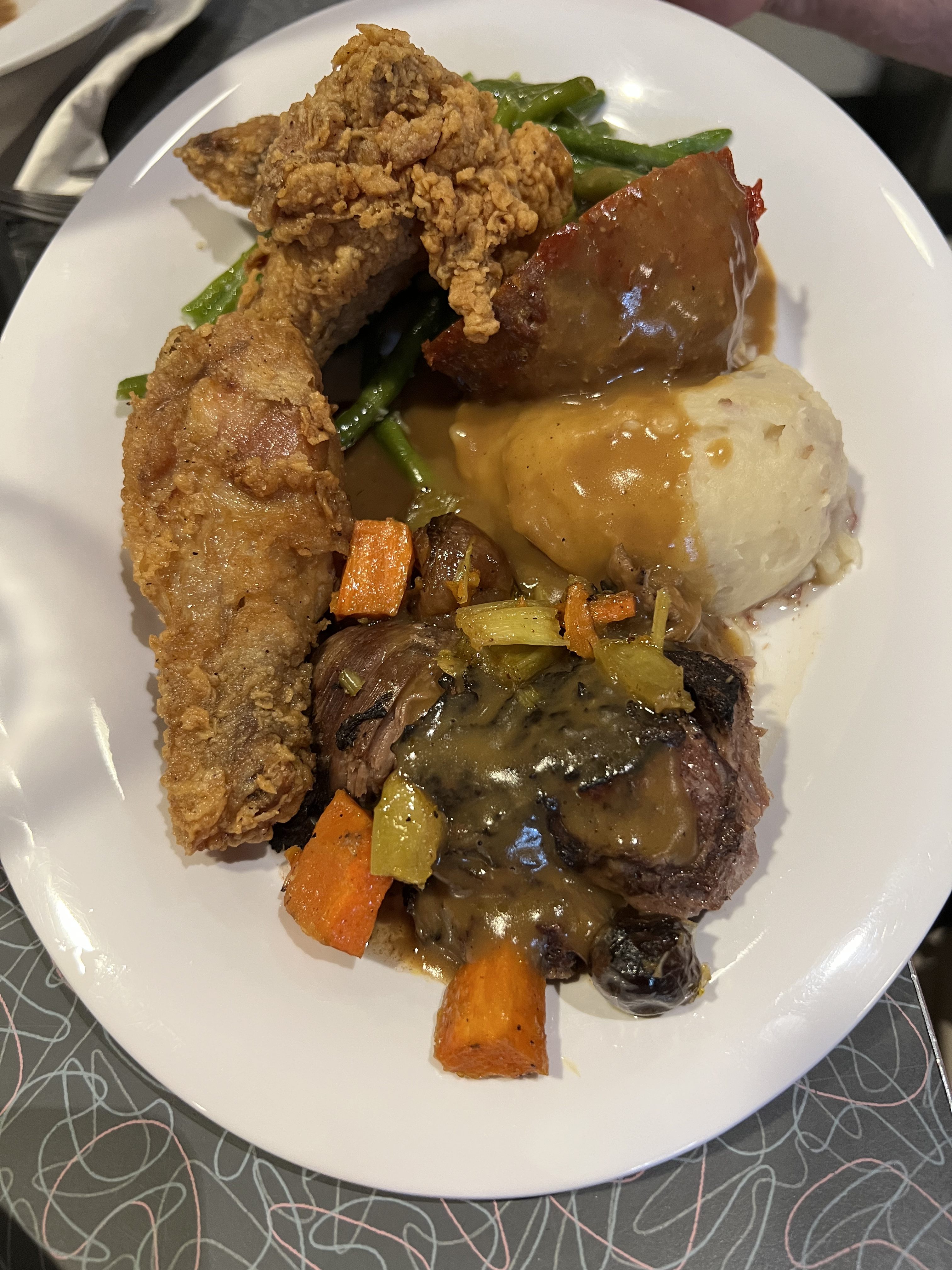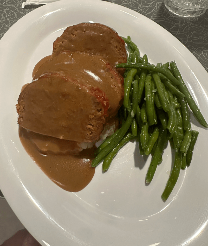 Cousin Megan’s Traditional Meatloaf – Blend of Beef and Pork served with Roasted Garlic Mashed Potatoes (hidden under the meatloaf slices) and Green Beans – $24.00 (price $25.00, Dec. 2024)