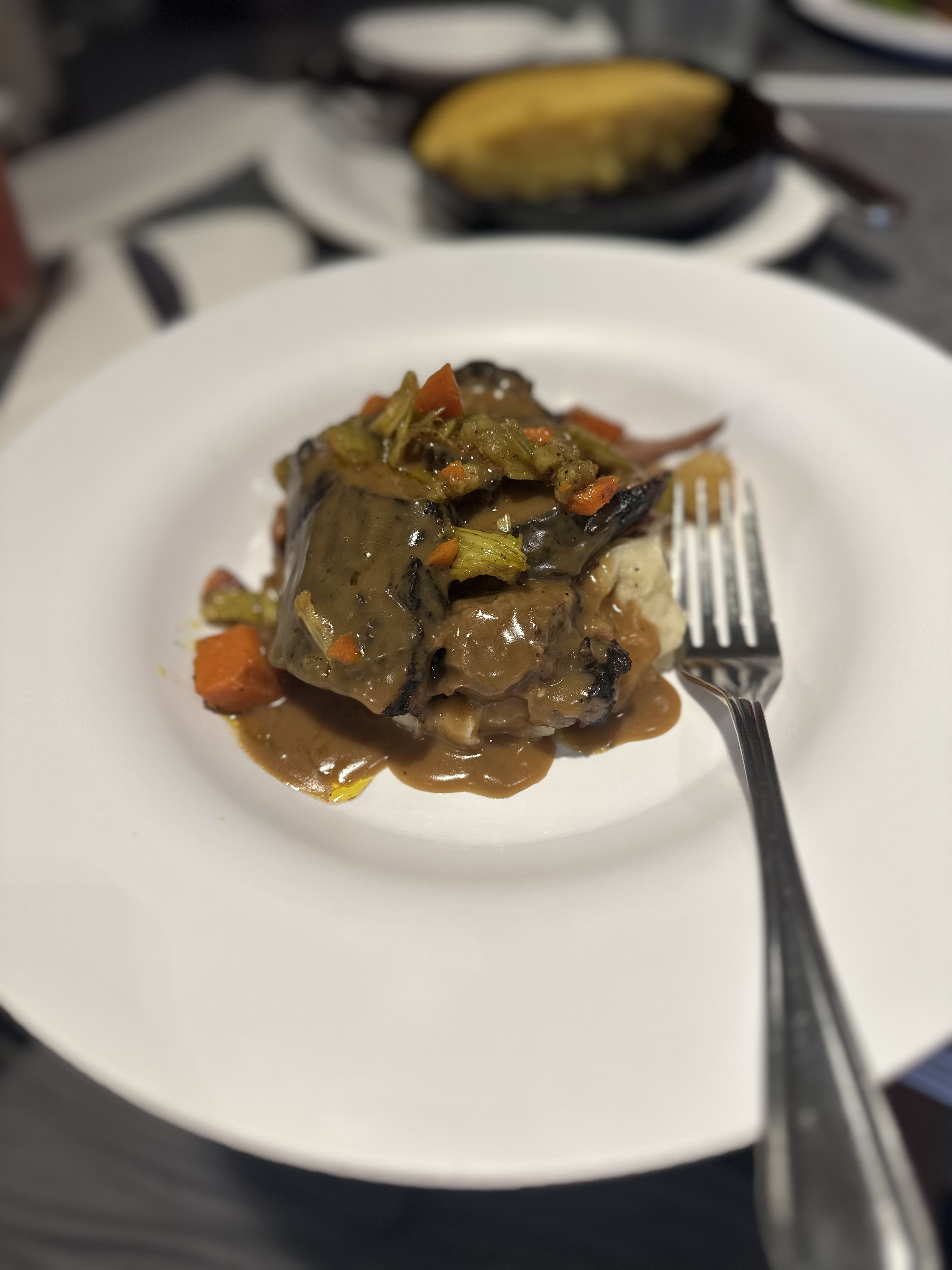 Mom’s Old-fashioned Pot Roast – Slow cooked ’til Fork-tender and served with Roasted Garlic Mashed Potatoes, Brown Gravy, Carrots, Celery and Onion – $26.00 (Price $28.00, December 2024)