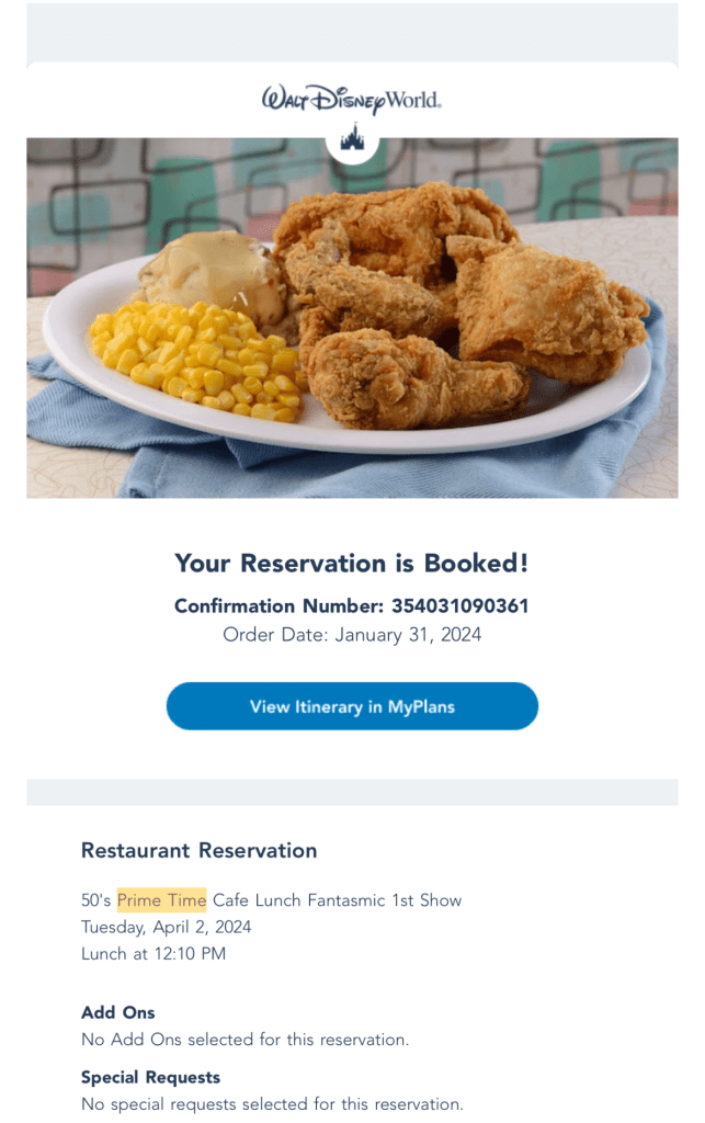 The Hollywood Studios restaurants which offer this package are 50’s Prime Time Cafe, Hollywood & Vine, Mama Melrose’s Ristorante Italiano, Sci-Fi Dine-In Theater Restaurant, and The Hollywood Brown Derby. I chose 50’s Prime Time because it was one of the least expensive options (only Sci-Fi is less) and it’s a family favorite. As of April 2, 2024 the price was $54.00 (plus tax & gratuity), however I see the price has now increased to $60.00 as of this writing (Dec. 2024).