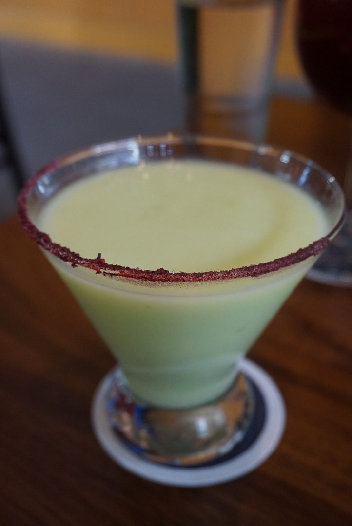La Cava Avocado Margarita with Casa Noble Blanco Tequila, Melon Liqueur, Avocado, Fresh Lime Juice, and a Hibiscus Salt Rim
