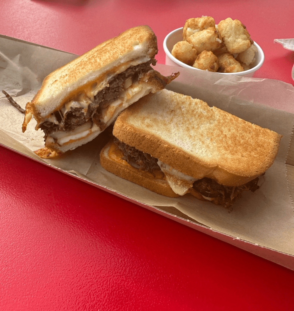 BBQ Brisket Melt (Gluten/Wheat Allergy-Friendly) – Shredded Smoked Brisket, Pickles, and Tangy Barbecue Sauce between Melted Cheddar and Monterey Jack on Grilled Allergy-Friendly Bread, served with Potato Barrels (aka Tater Tots) – $13.29 (Price as of Dec. 2024 is $13.99)