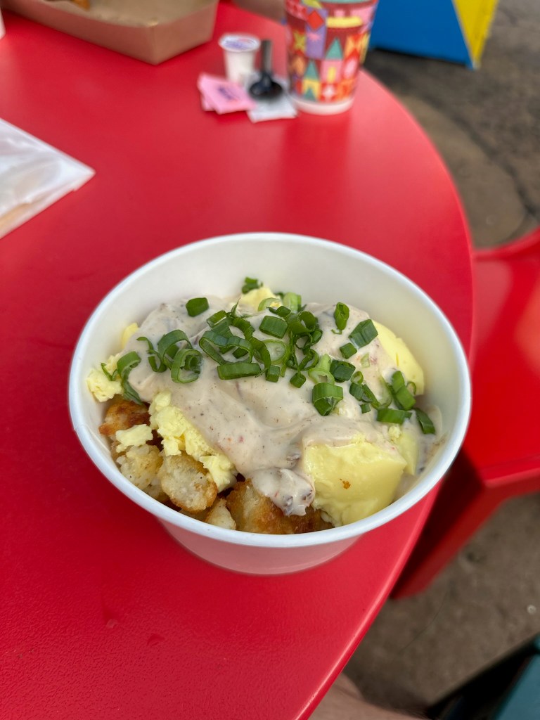 Breakfast Bowl – Hearty Portion of Potato Barrels smothered in Smoked Brisket Country Gravy, Scrambled Eggs and a sprinkling of Green Onion – $8.79