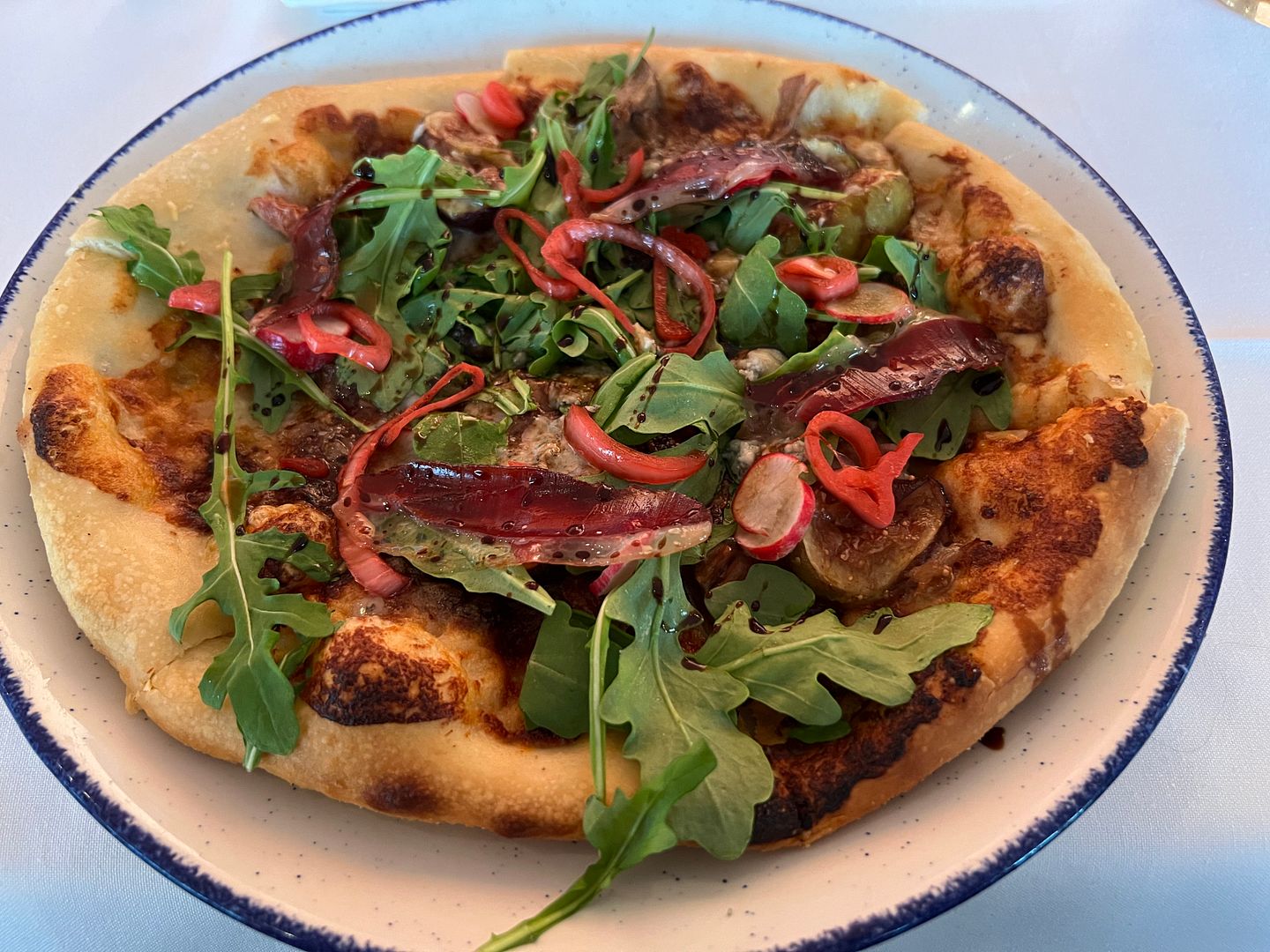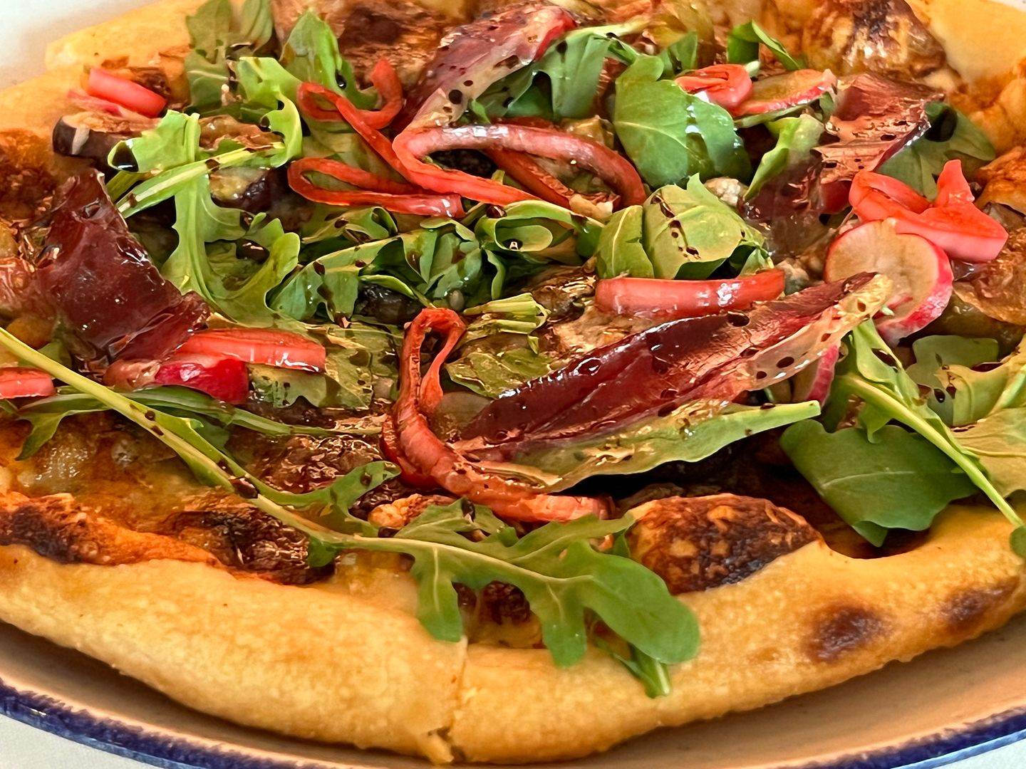 While there were things I liked about this pizza…the crust, duck, and the combination of fig and blue cheese, there were others I could have done without. I did not enjoy the arugula and pickled shallots and there was just so much of them on this pizza. So much that it was very difficult to pick them off. I gave this a rating of 3. Andrew wouldn’t even try it so most of it was wasted.