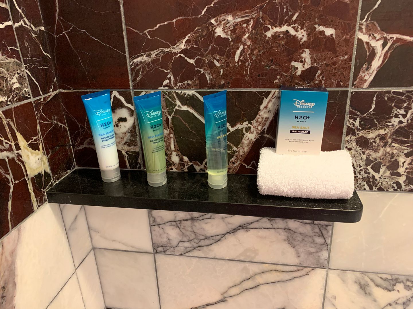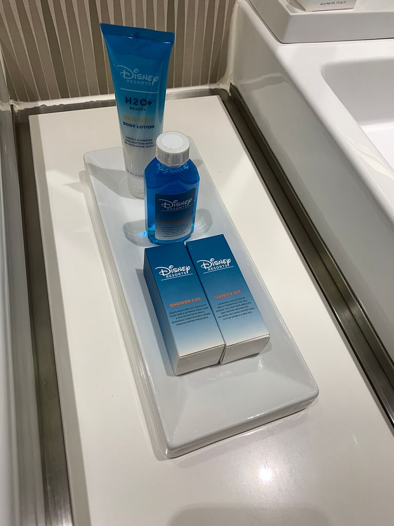 Unlike the Polynesian though there was just a tiny bit of counter space in between the two sinks. This area was pretty much filled by the tray of complimentary toiletries (H20+ Body Lotion, mouthwash, shower cap, and vanity kit). There was a shelf underneath the sinks (where a hairdryer was stored) where you could put your things though.