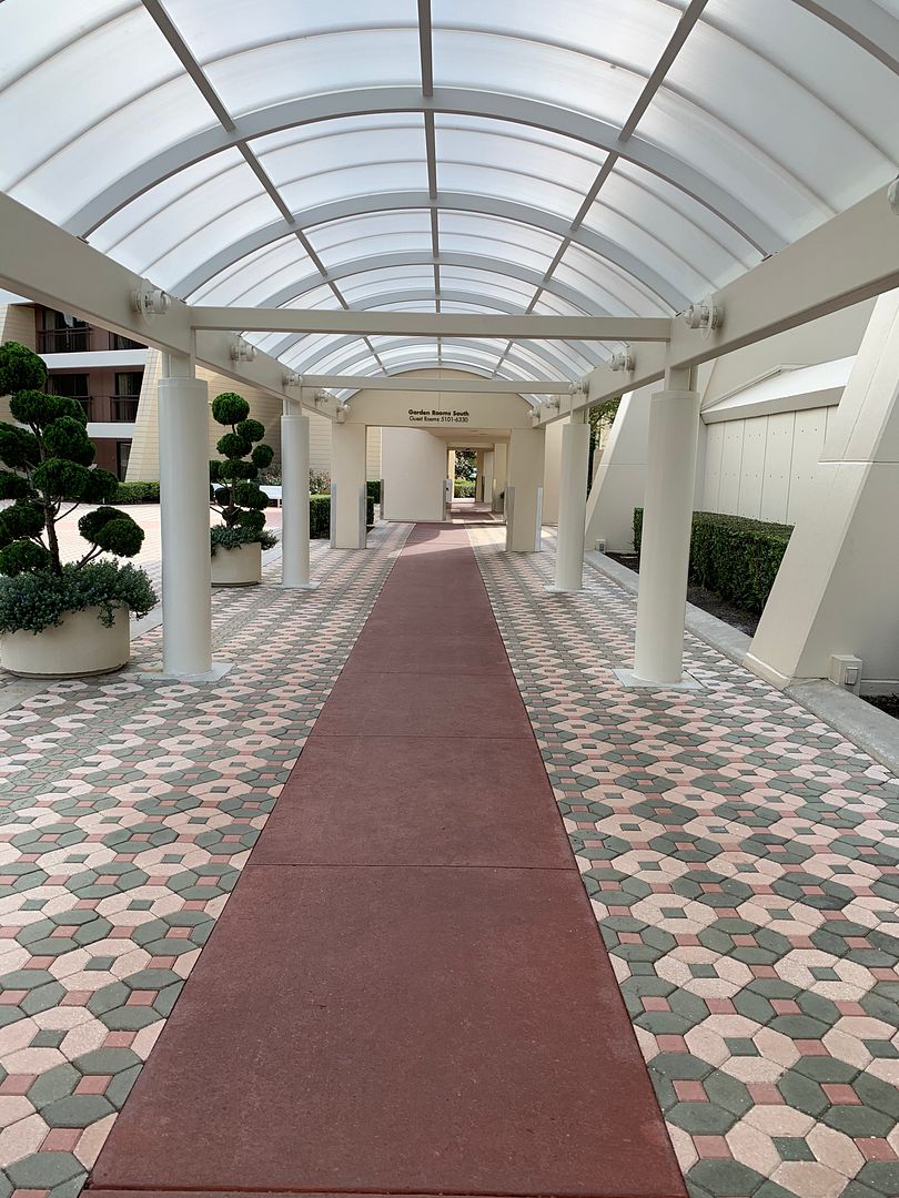 Ok, now back to the Contemporary. We arrived on the Magical Express bus at about 12:30 at night so we walked straight through the lobby and out the door to the covered walkway which led to the Garden Wing building. Here’s what it looked like the next day when it was light outside…