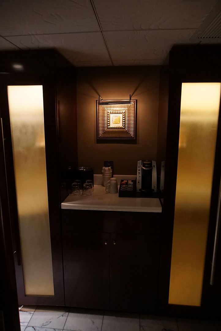 On top of the cabinet between the two closets was the beverage station. Here you could find an ice bucket, glasses, two coffee mugs, and some disposable cups. Also provided were a Keurig single serve coffee maker along with an assortment of K cups (Joffrey’s french roast regular and decaf coffee plus Twinings English Breakfast and Green teas). They also provided packets of sugar, sugar substitute and Coffeemate creamer…