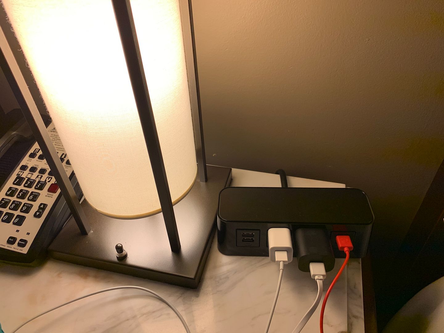The night stand between the beds held the phone, a stylish lamp, and a very conveniently located USB port and electrical outlet station…