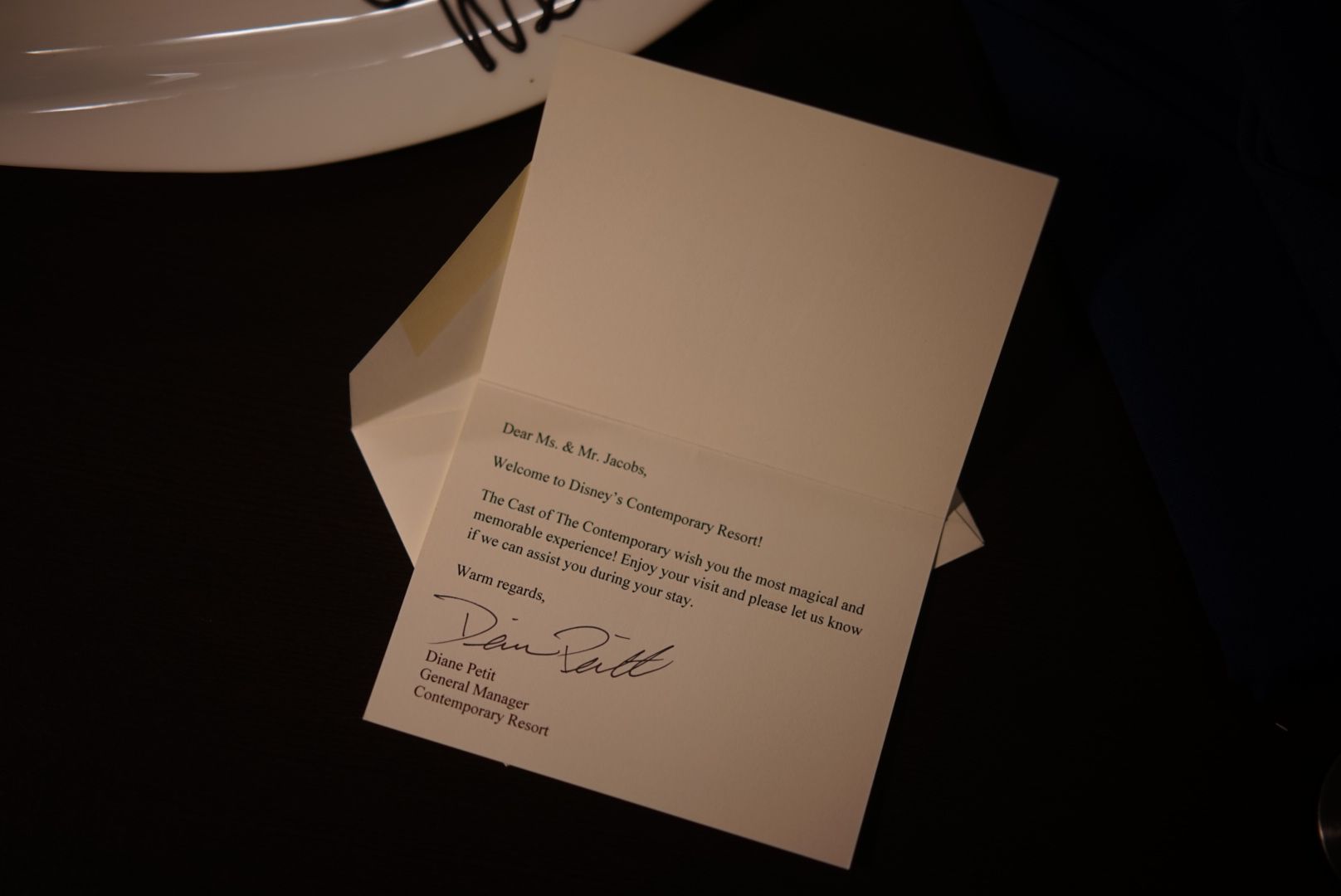 You may recall from my trip report introduction that our 5 night stay at the Contemporary was divided into two consecutive reservations, the first for 3 nights and then a second reservation for 2 nights. After a second Welcome platter (nearly identical to this one) and card appeared on the day that our second reservation began (even though we did not change rooms), I have to assume that this is something they are currently doing for all of their guests. Very nice touch!