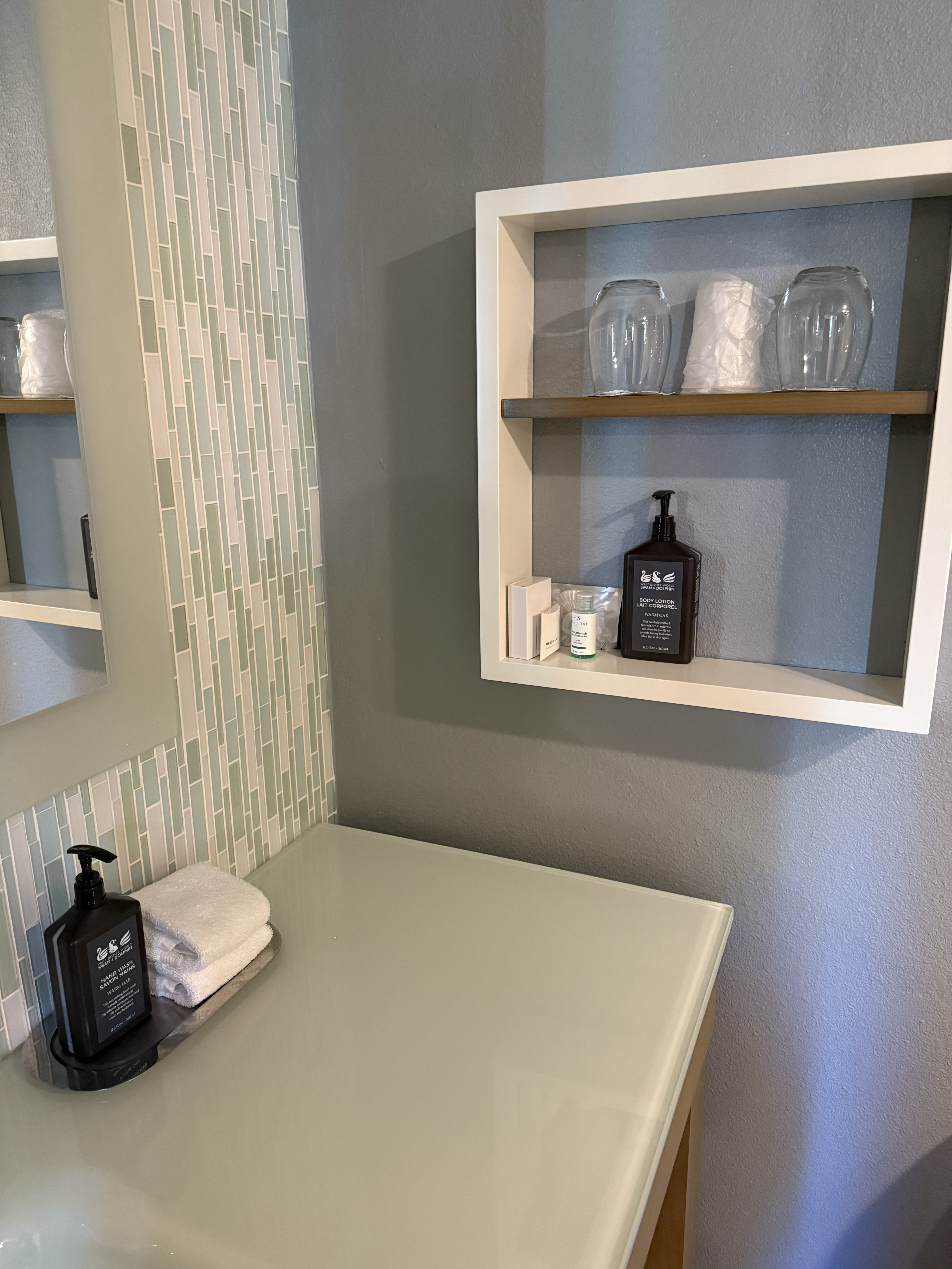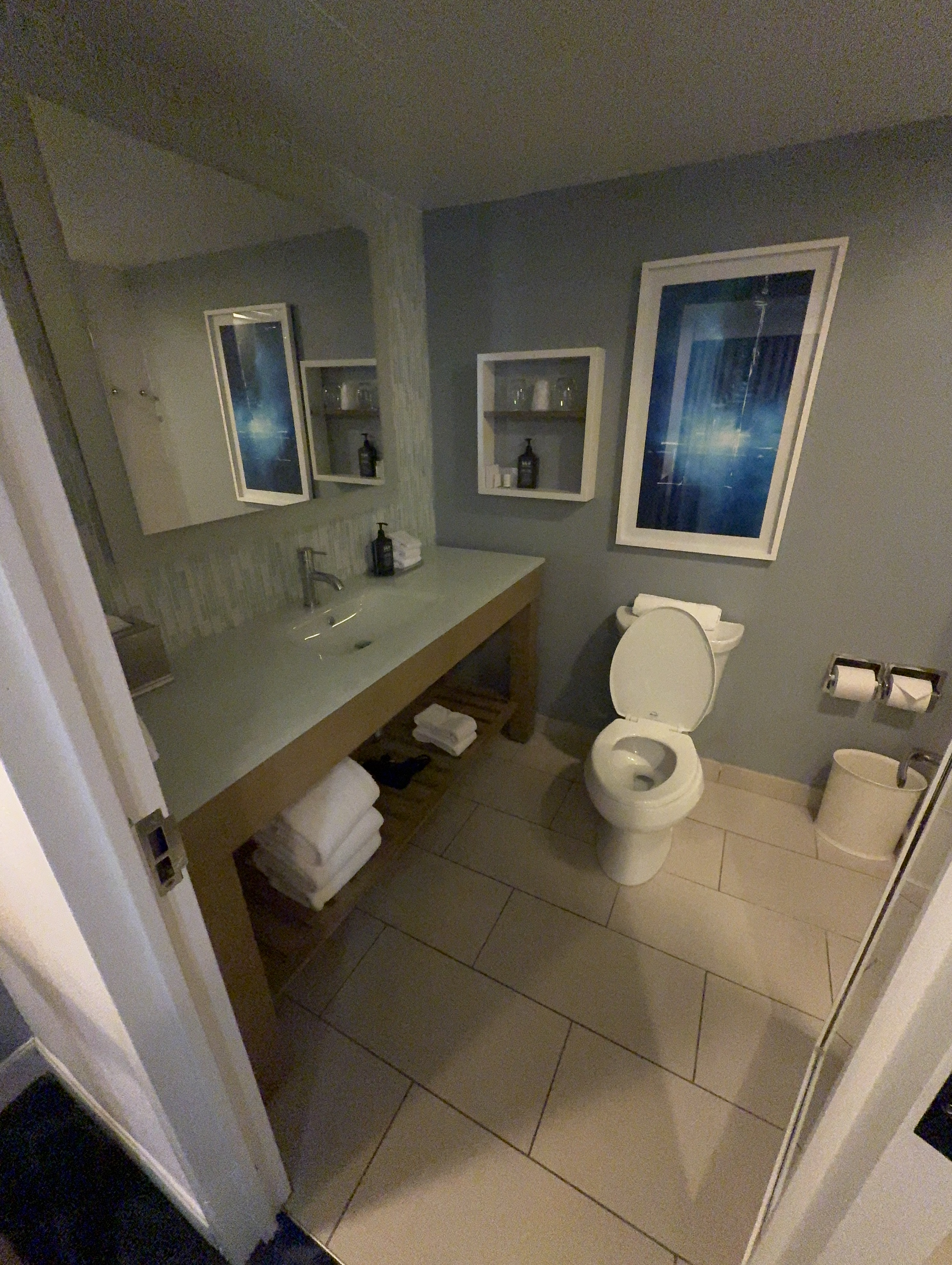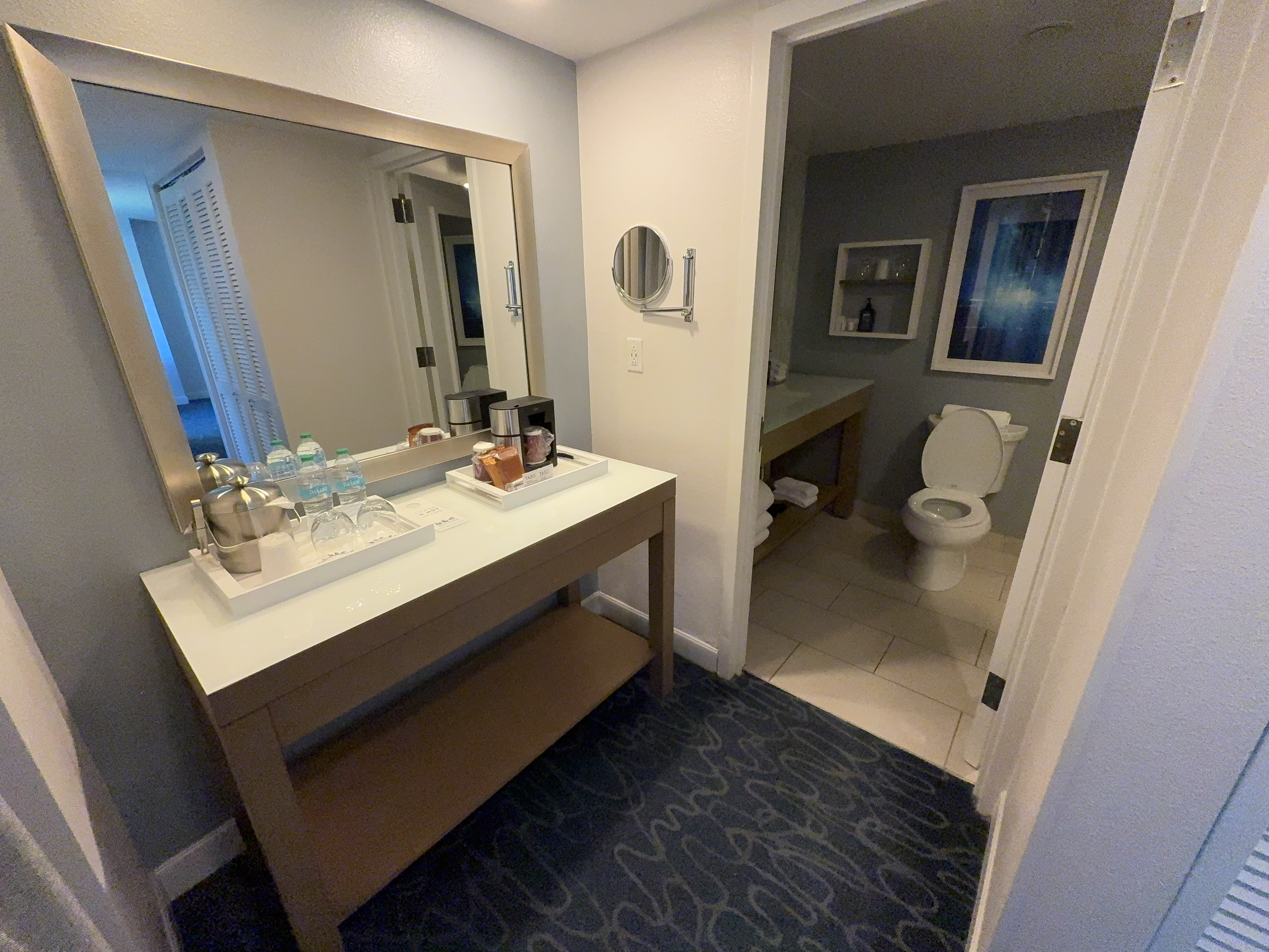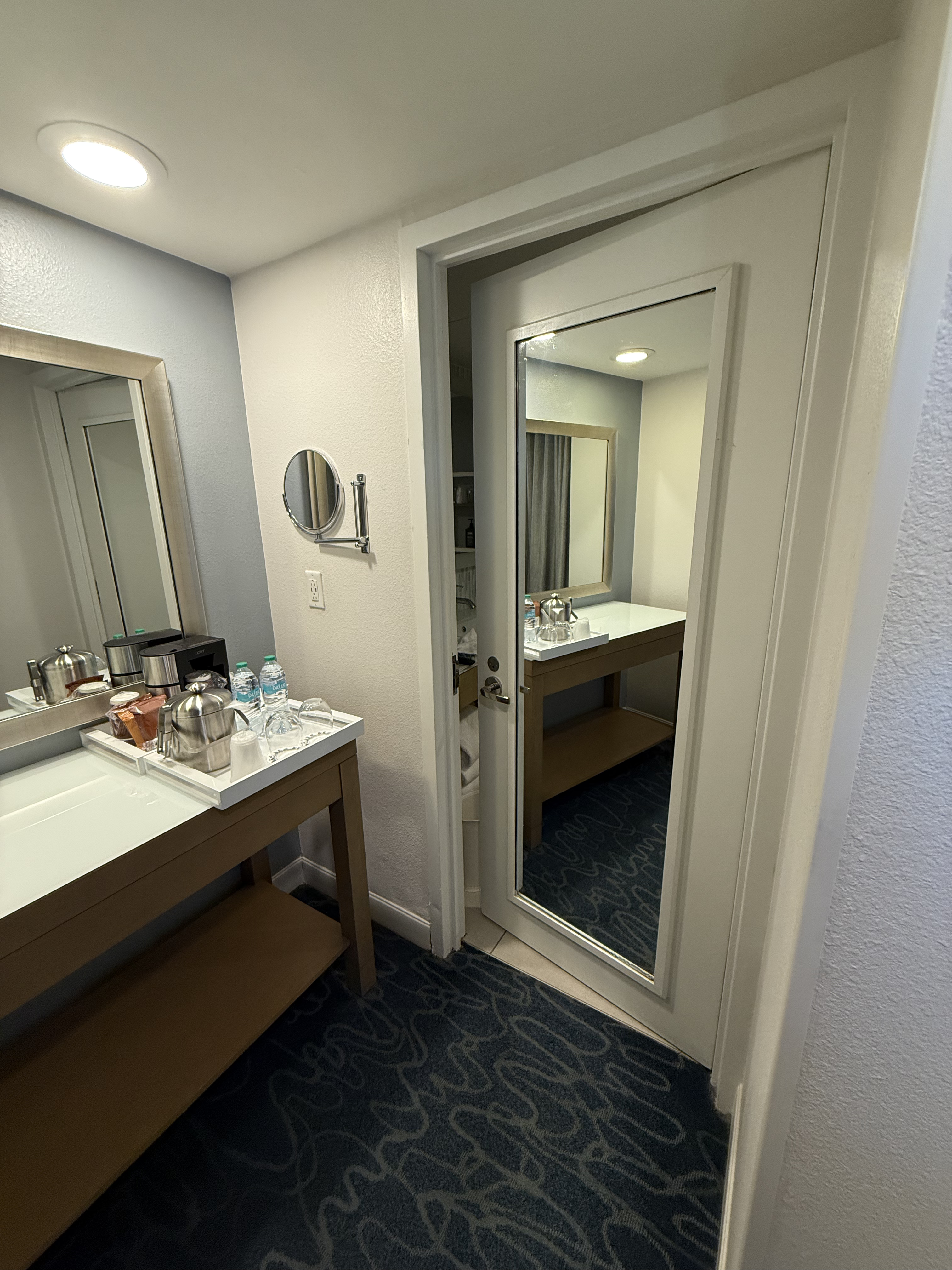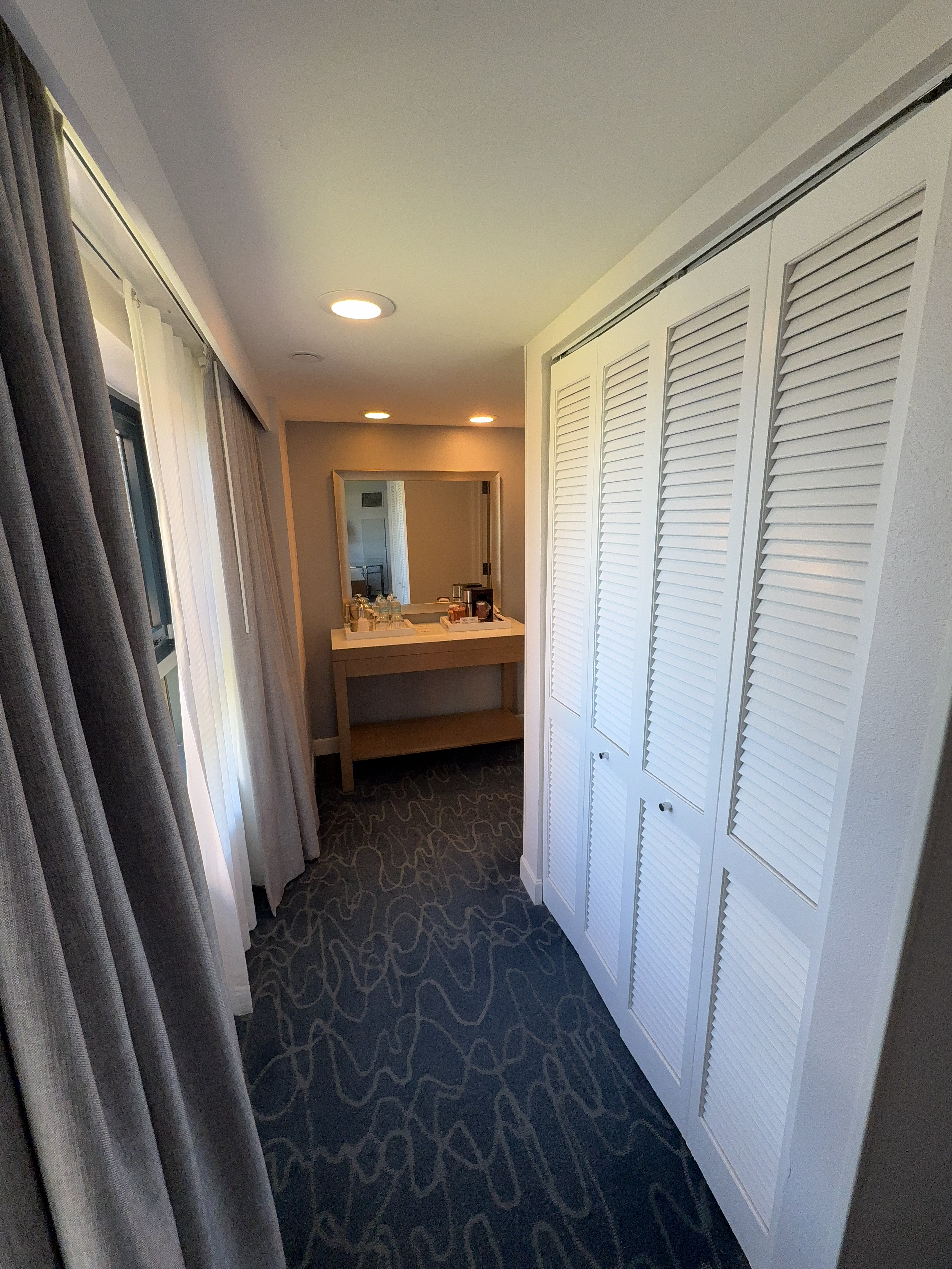 I love it when hotel rooms have this separate area where someone can do their hair and/or makeup, etc. without tying up the bathroom. I liked having the storage shelf underneath where you could store what you needed to do your hair, makeup, etc. without taking up space on the bathroom counter. I also liked that this area was mostly hidden behind a wall, allowing for more privacy if desired. The only thing that would have made this area even better would have been for it to have a sink. But I will take this over what we had in the other two rooms of our trip.