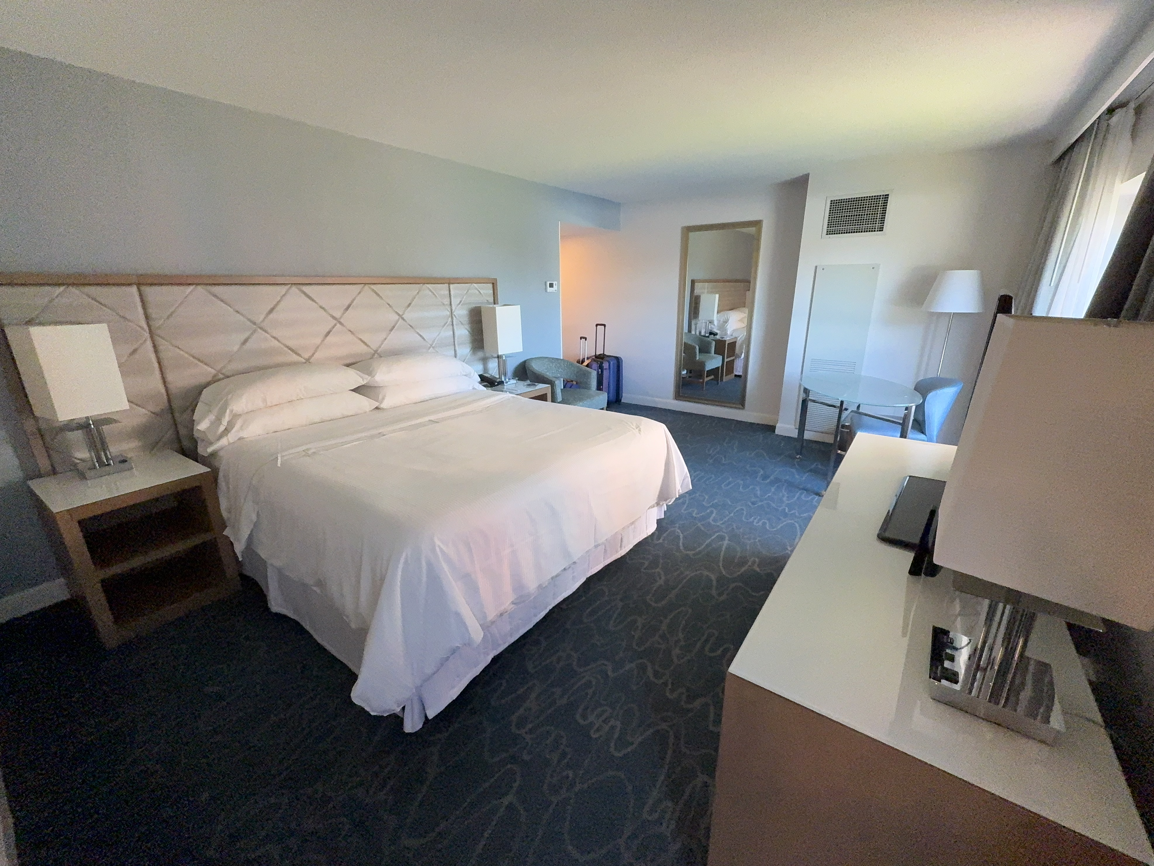 Ok, let’s move on now to our stay at the Dolphin, starting with our arrival and check-in, which unfortunately did not go very smoothly. Having stayed at the Swan last year, I still had the Marriott Bonvoy app on my phone and had used it to do their online check in advance of our trip. However, when we arrived at the hotel at about 4:00 (their check-in time) I had still not received our room assignment. But more inconvenient than that was that their guest parking lot was completely full and arriving guests were instructed to unload their luggage and then drive over to the Swan where they still had parking available. So my husband dropped me off along with the small amount of luggage we needed for our one night stay and left for the Swan while I made my way to the Lobby desk to check in a second time. Unfortunately I discovered that the Dolphin was hosting a large convention beginning that day and there was a long line of guests waiting to check in. So now I understood why their large Guest Parking lot was completely full. Anyway, my husband drove to the Swan, parked the car and took his time walking back from the Swan to the Dolphin hotel and still was able to join me in line before it was my turn to check in. Ugh!