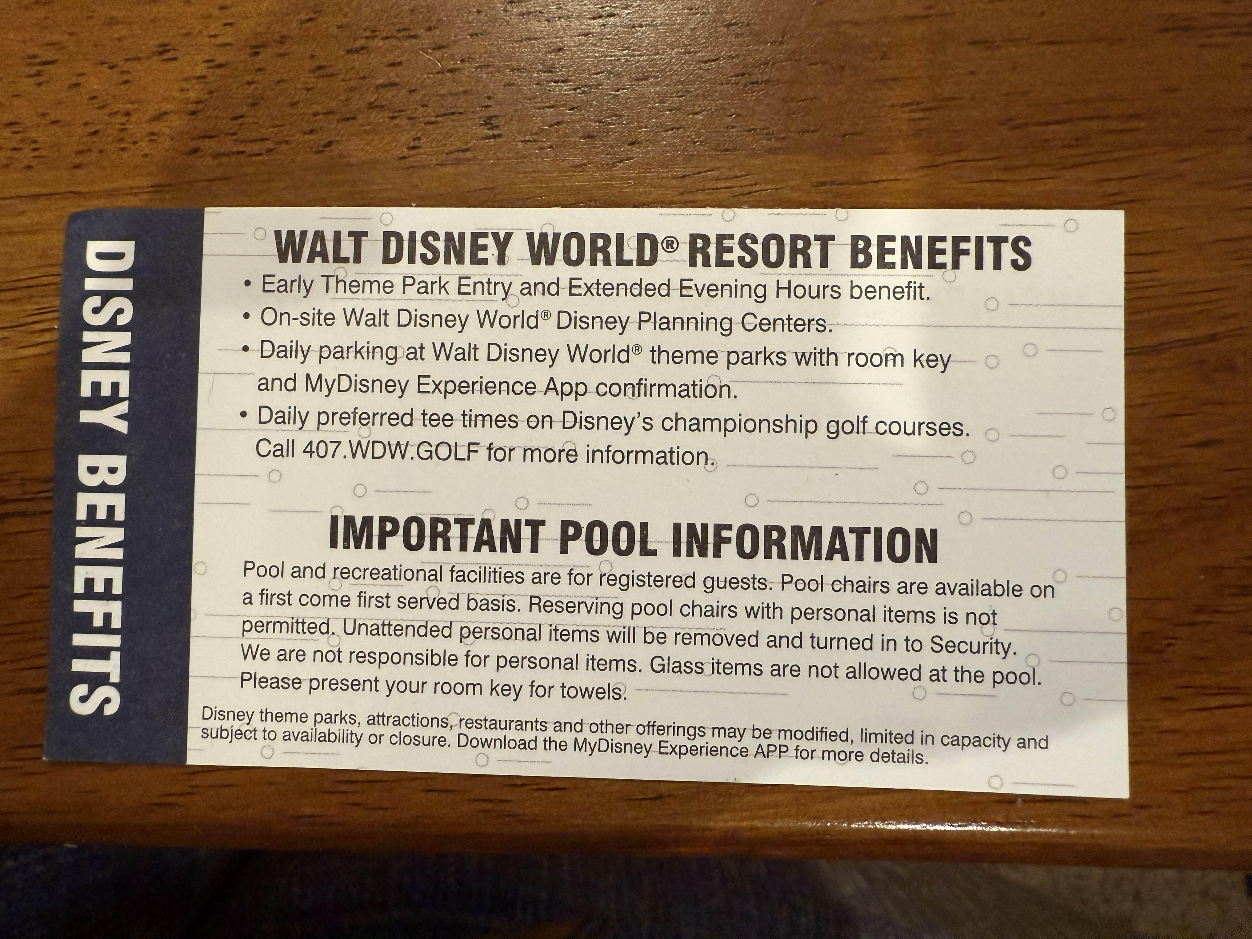 As I explained previously in my trip report, my husband and I stayed for one night at the Dolphin using Marriott Rewards Points at the beginning of our 9 night Disney World trip. Though the points (52,000 points for Wednesday night, March 19th) covered the room cost (including tax), it did not cover the Swan & Dolphin Resort’s Daily Resort Service Package Fee of $50 ($56.25 with tax). NOTE: Just one year earlier (April 2024) this fee was $40 plus tax per night when we stayed at the Swan.