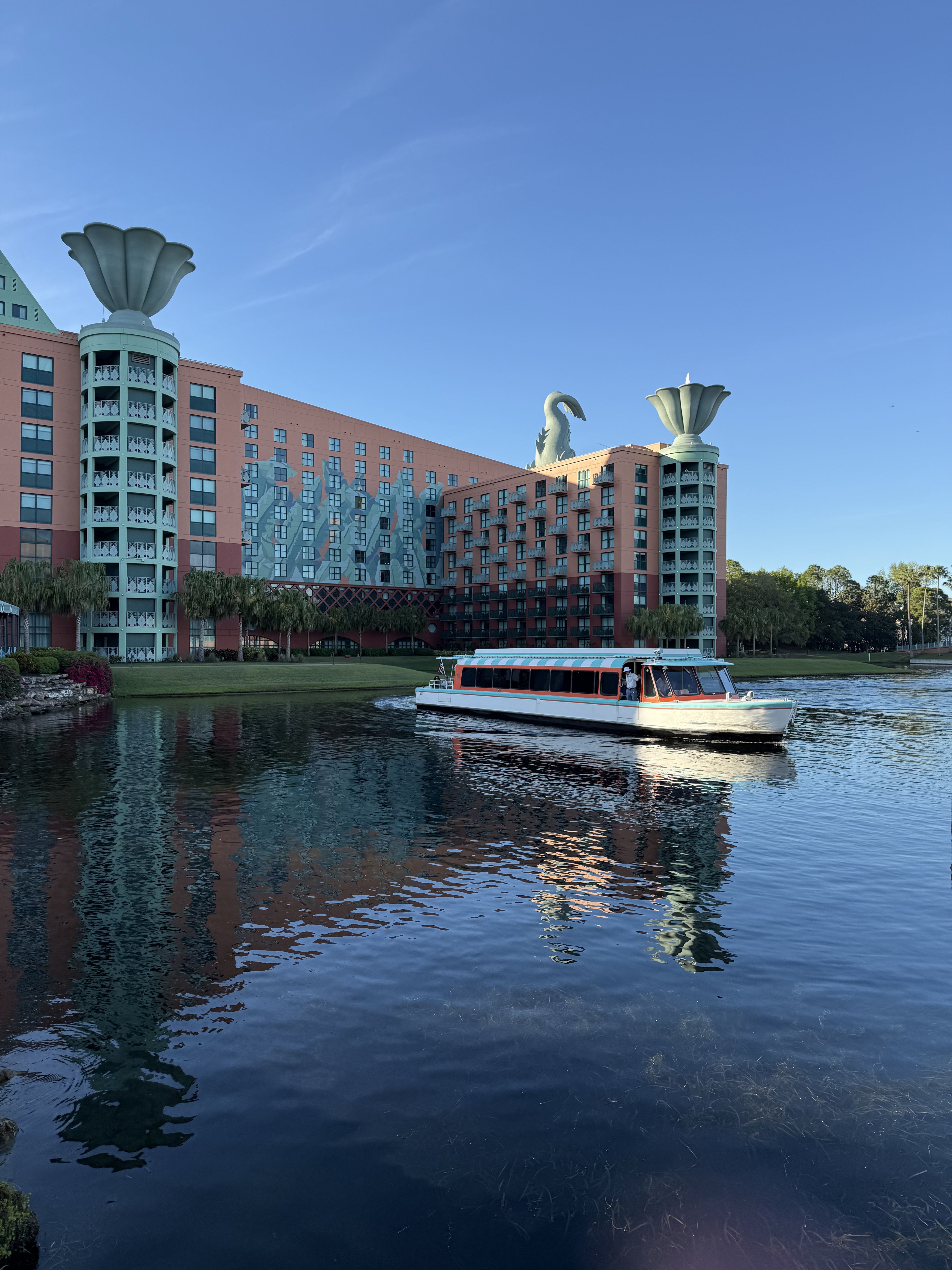 I think the boats take about 30 – 45 minutes (or more if you have to wait for a boat) to make this route between the parks. So if you are able, it’s generally faster to walk to either Epcot or Hollywood Studios from the Swan & Dolphin. But the boat is a great option for tired feet.