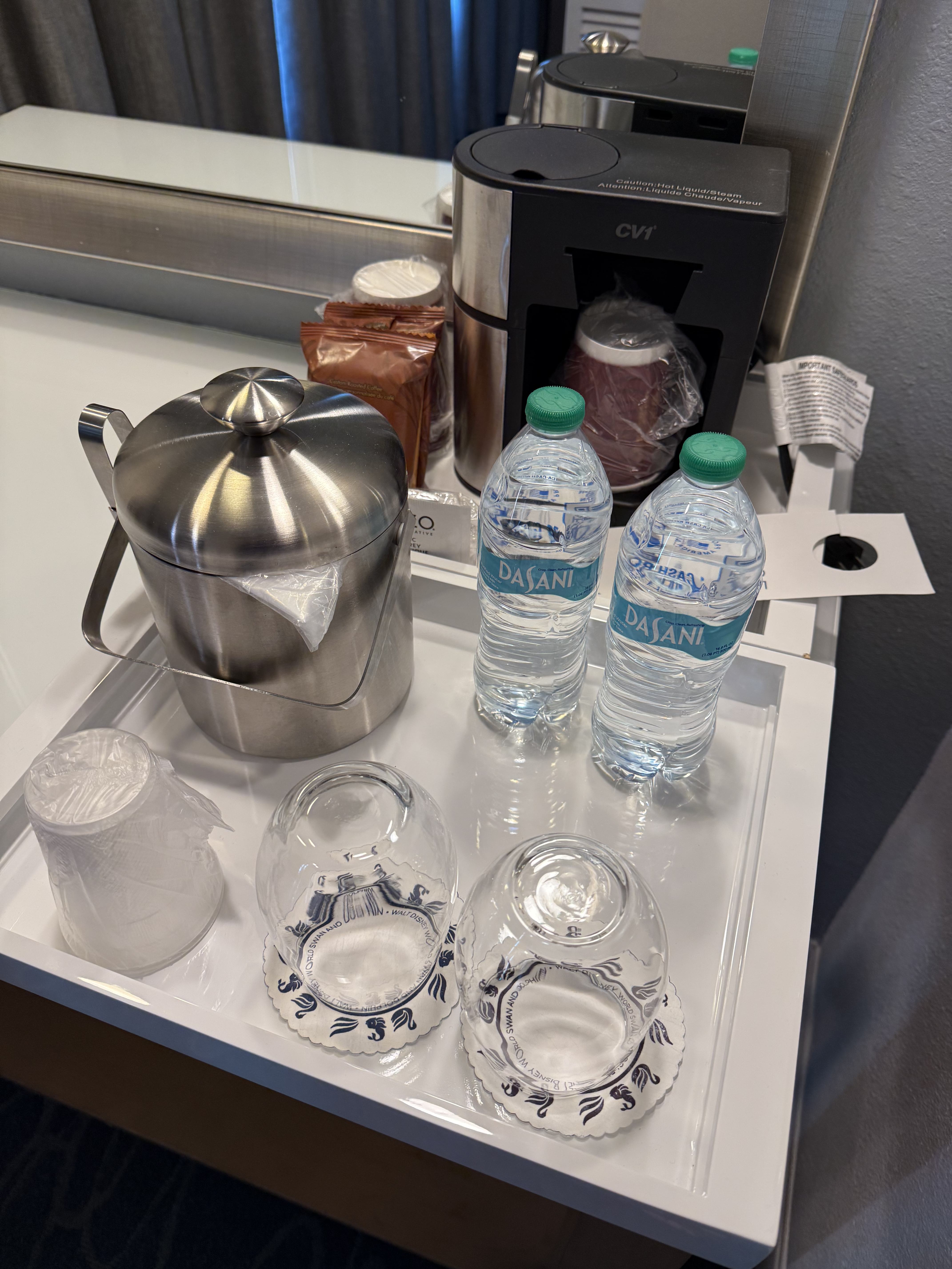 Anyway, it was in this area that you could find the single serve coffeemaker, ice bucket and the complimentary bottles of Dasani water…