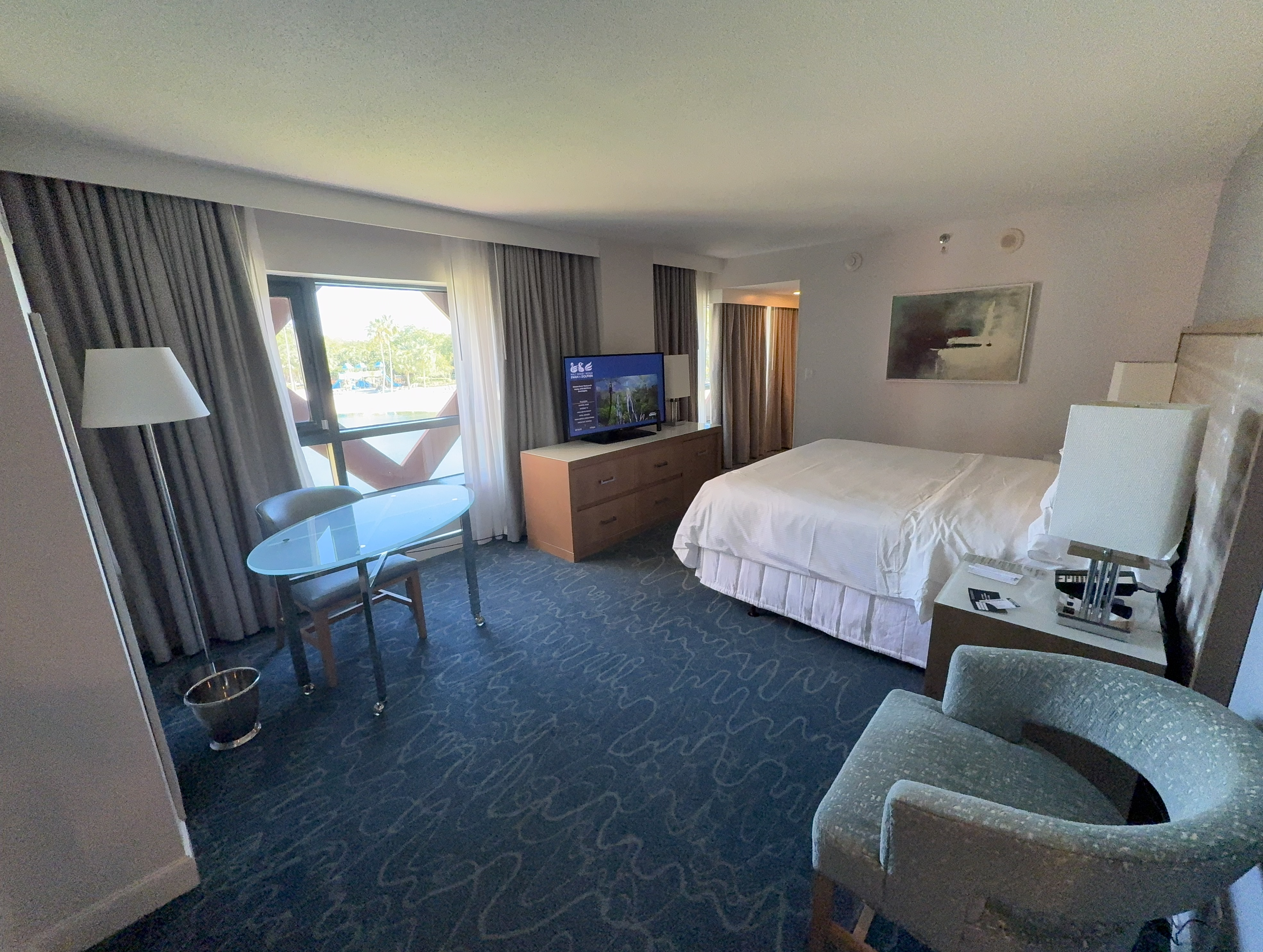 So overall my thoughts regarding the Dolphin are mixed. I like it’s location, since Epcot is my favorite park, and I like that the room rates are much less than those of their neighbor hotels, which are owned by Disney. I also like that I could use my Marriott Rewards points to stay there. However, I don’t like the Resort fees that you are forced to pay and having to pay to park your car there. It was especially a bummer when we had to park our car in the lot of another hotel and still had to pay. I also don’t like that the Dolphin is a big convention hotel, so for that reason I would probably choose the smaller and quieter Swan hotel over the Dolphin, if deciding between the two. Also a plus for the Swan over the Dolphin is that their standard rooms have two queen size beds. We were lucky to get a room with a King size bed because the standard rooms at the Dolphin have two full size beds. But all that said, I have to give props to the Dolphin for allowing us to stay in what seemed to be an oversized room with a lovely view while using Rewards points. And again, I loved the configuration of that room. It was probably our favorite room of this trip so I wish we could have stayed there for more than one night. But sadly, tomorrow we would be moving on to another hotel room…one that would pale in comparison.