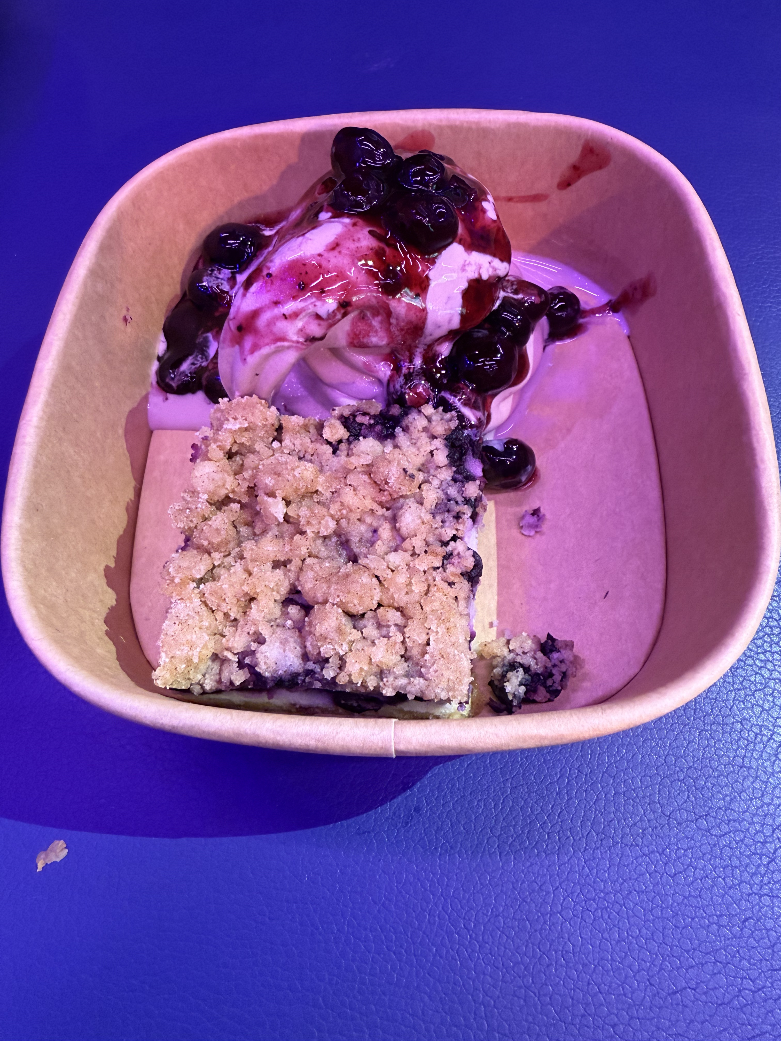 Blueberry Crumble Cake with Blueberry-Lemon Zest Soft-Serve Ice Cream and Blueberry Compote – $4.75