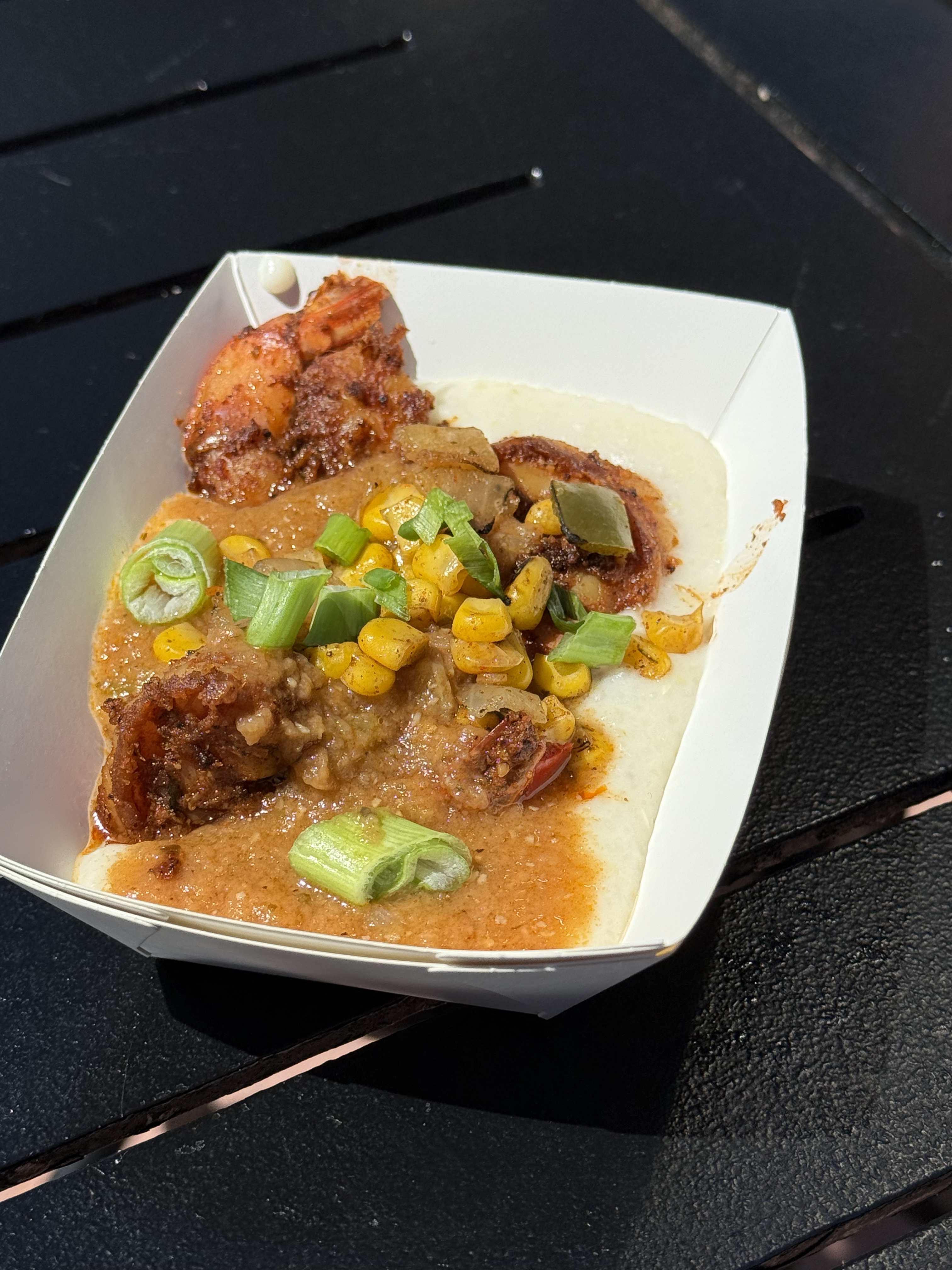 Shrimp and Grits: Blackened Shrimp and Cheddar Cheese Grits with Brown Gravy and Sweet Corn Salsa – $7.75