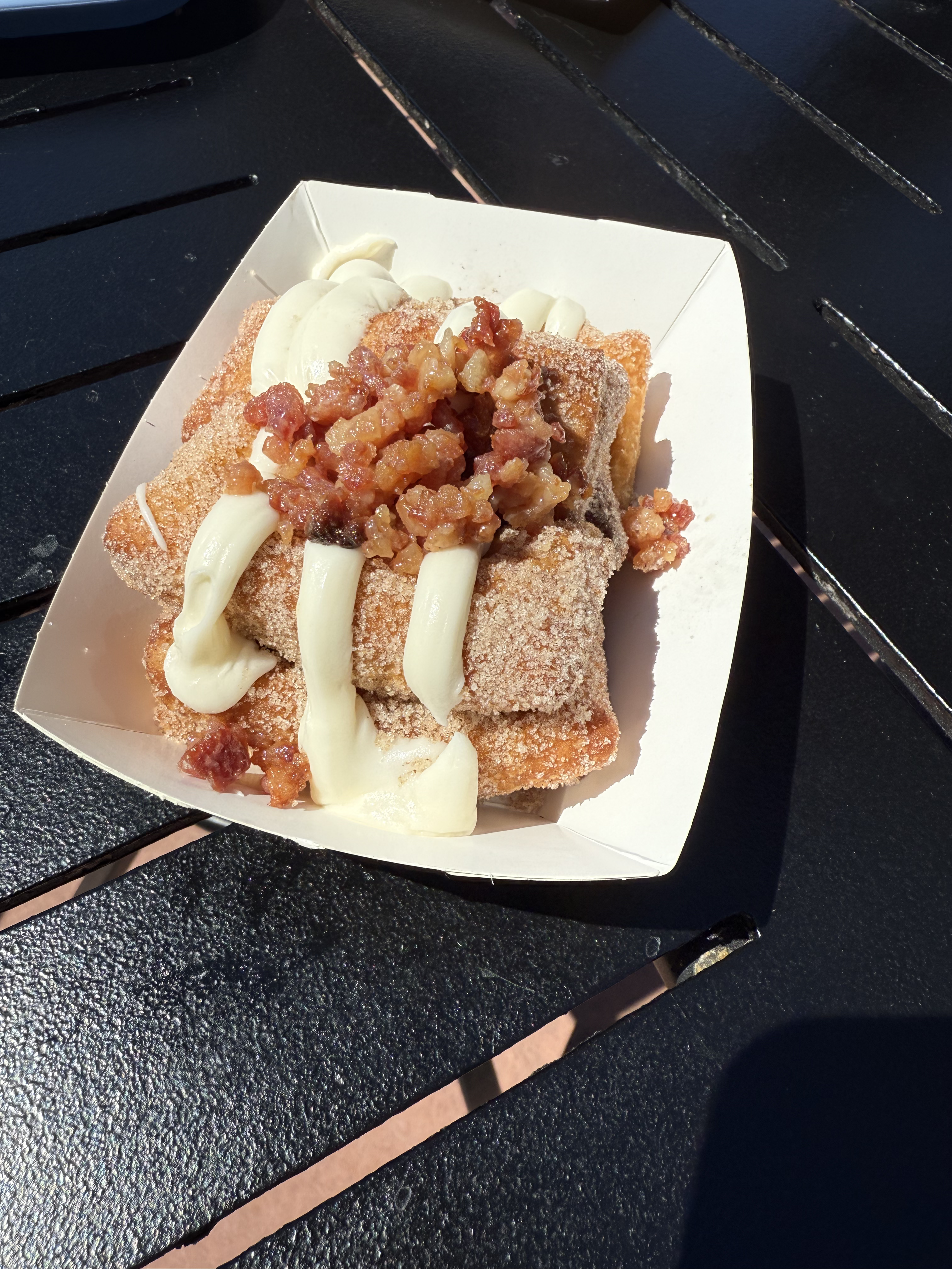 Fried Cinnamon Roll Bites with Cream Cheese Frosting and Candied Bacon – $5.25