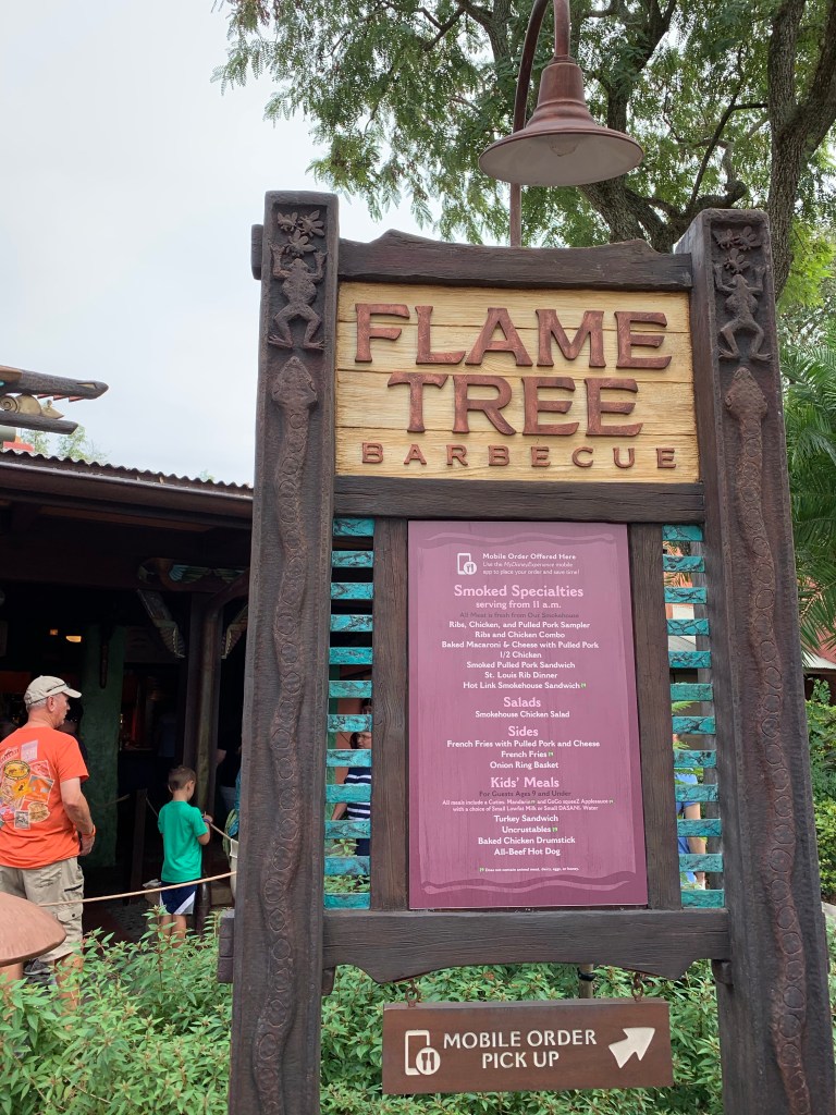 It had been at least 5 years since we had eaten at Flame Tree Barbecue, a quick service restaurant at Animal Kingdom. It used to be a favorite of Andrew’s and since we were on the Dining Plan I thought this would be the perfect opportunity to re-introduce ourselves to Flame Tree. Seeing on their sign that Mobile Ordering was available (through the MDE app on our phone), we decided to first find a table. We chose one down by the water, which seemed like a very peaceful setting to have our lunch.