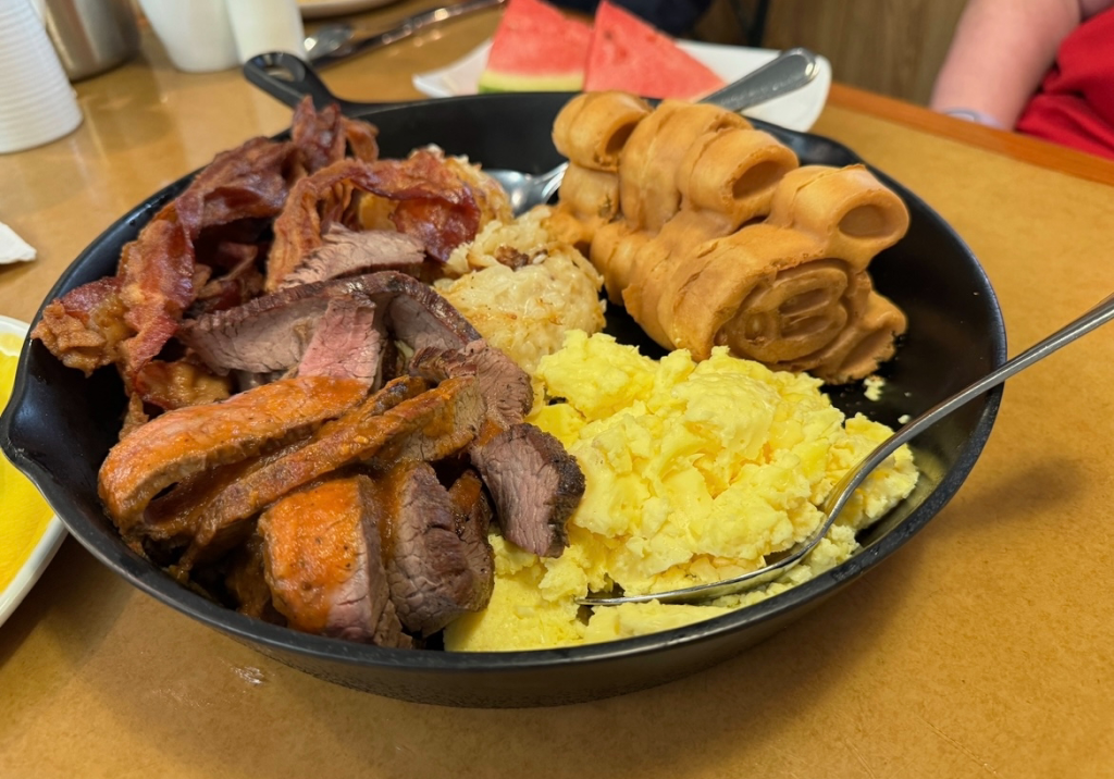 Starting with the Mickey waffles and moving clockwise are Scrambled Free-range Eggs, Backyard Grilled Steak topped with Farmer’s Ranchero Sauce, Smoked Bacon, and Skillet Potatoes.