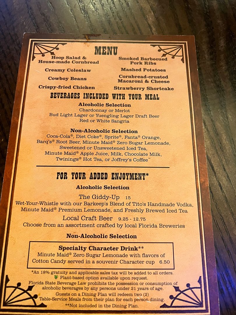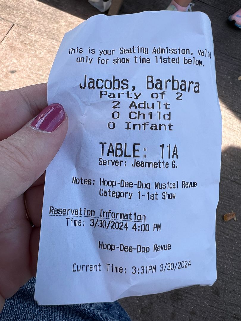 You are advised to arrive at Pioneer Hall 30 minutes prior to your reservation time, which was 4:00 for us. Through some research I had discovered that the Blue Flag boats had resumed service on October 1, 2023. These small boats transport guests between the Contemporary Resort, Wilderness Lodge, and Fort Wilderness. The one change from their previous service was that they are now only available from 3:00 p.m. – 10:45 p.m. (previously they started very early in the morning). But the later start time still worked for us and was a very convenient way to get from the Contemporary (our resort) to Ft. Wilderness for the 4:00 Hoop-Dee-Doo show. We made our way to the Contemporary boat dock a little before the first boat was scheduled to arrive at 3:00. We had enough time for a couple of rounds of foosball (located by pool/dock) before the two Blue Flag boats arrived, which was a little later than 3:00. One of the boats was headed to the Wilderness Lodge and the other (the one we boarded) headed directly to the Ft. Wilderness boat dock. It was a pretty quick boat ride and then a very short walk from the Ft. Wilderness boat dock to Pioneer Hall. We arrived before they started checking in guests at 3:30 so we sat down at a picnic table and struck up a conversation with some other guests waiting there. I was then one of the first in line when they began checking people in, however it doesn’t really matter because I believe your table is pre-assigned at the time of booking. All I had to do to check in was give the cast member my name and they then printed out and gave me this Seating Admission ticket…