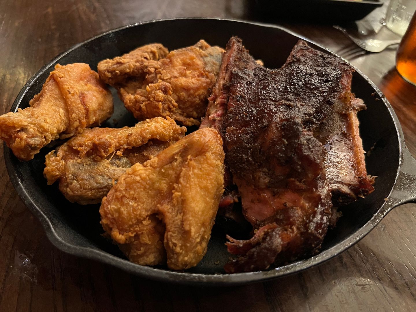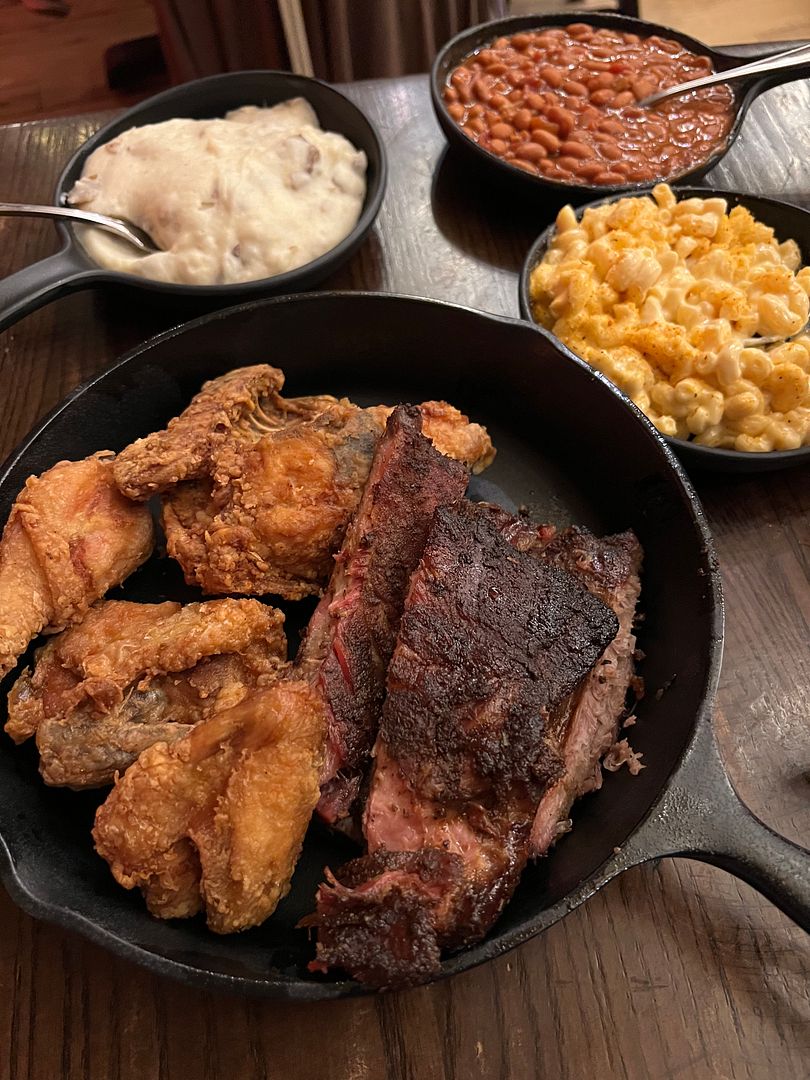 In my opinion, while the ribs were good, they paled in comparison to the fried chicken. We were served 1/2 a chicken on this platter (with one each of breast, wing, thigh, and leg). Since we both prefer breasts, I asked for and received a second chicken breast. And I’m glad I did because it was excellent. Crispy on the outside and moist and juicy on the inside. No salt needed to be added because it was perfectly seasoned. I suspect that this chicken was brined for several hours before frying. We both gave our chicken breast a perfect rating of 5.
