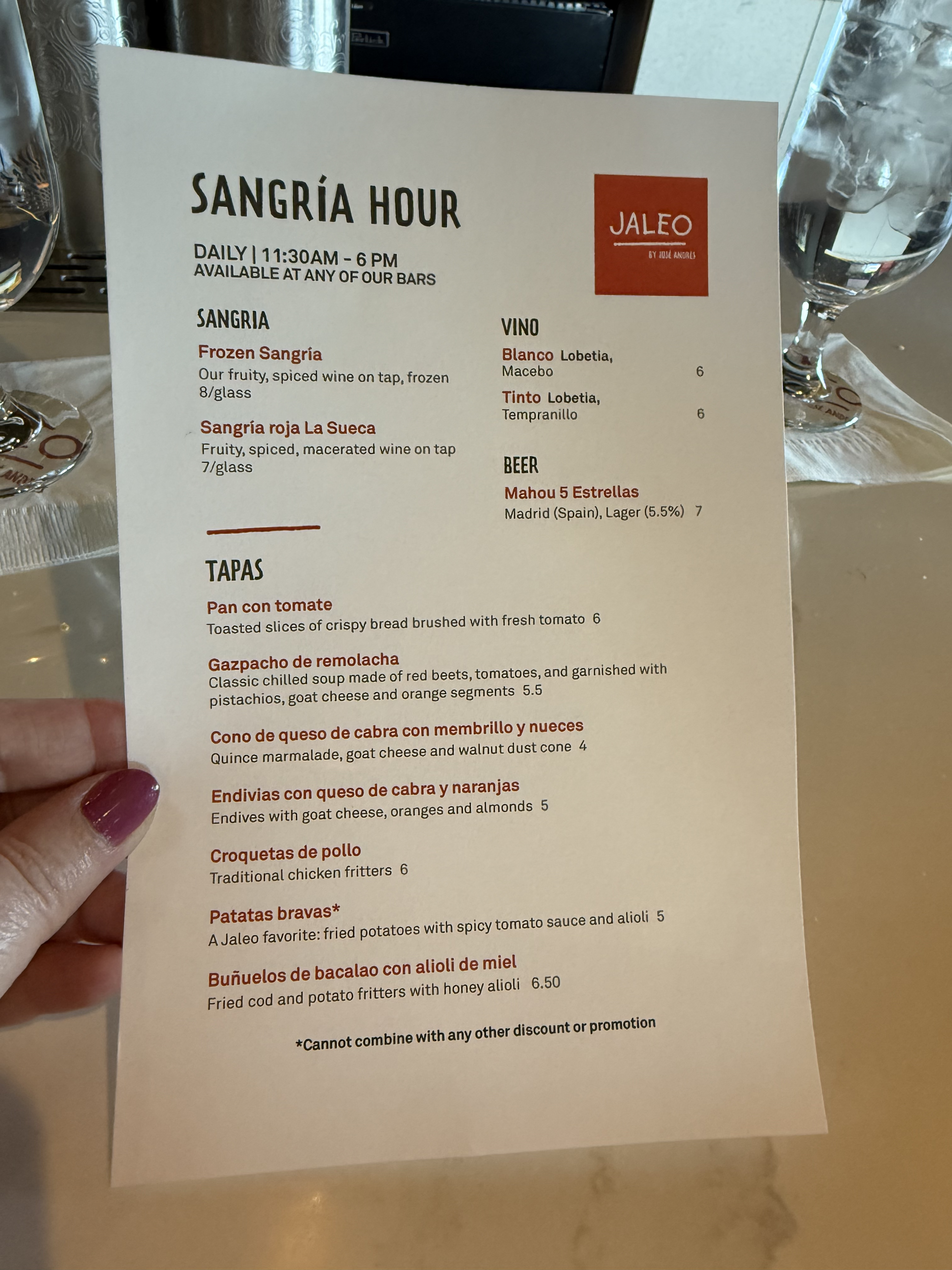 Sangria Hour at Jaleo in Disney Springs is something I had heard about when researching for our last Disney trip in 2024. Unfortunately we didn’t get to try it then, so I was determined to get there this time.