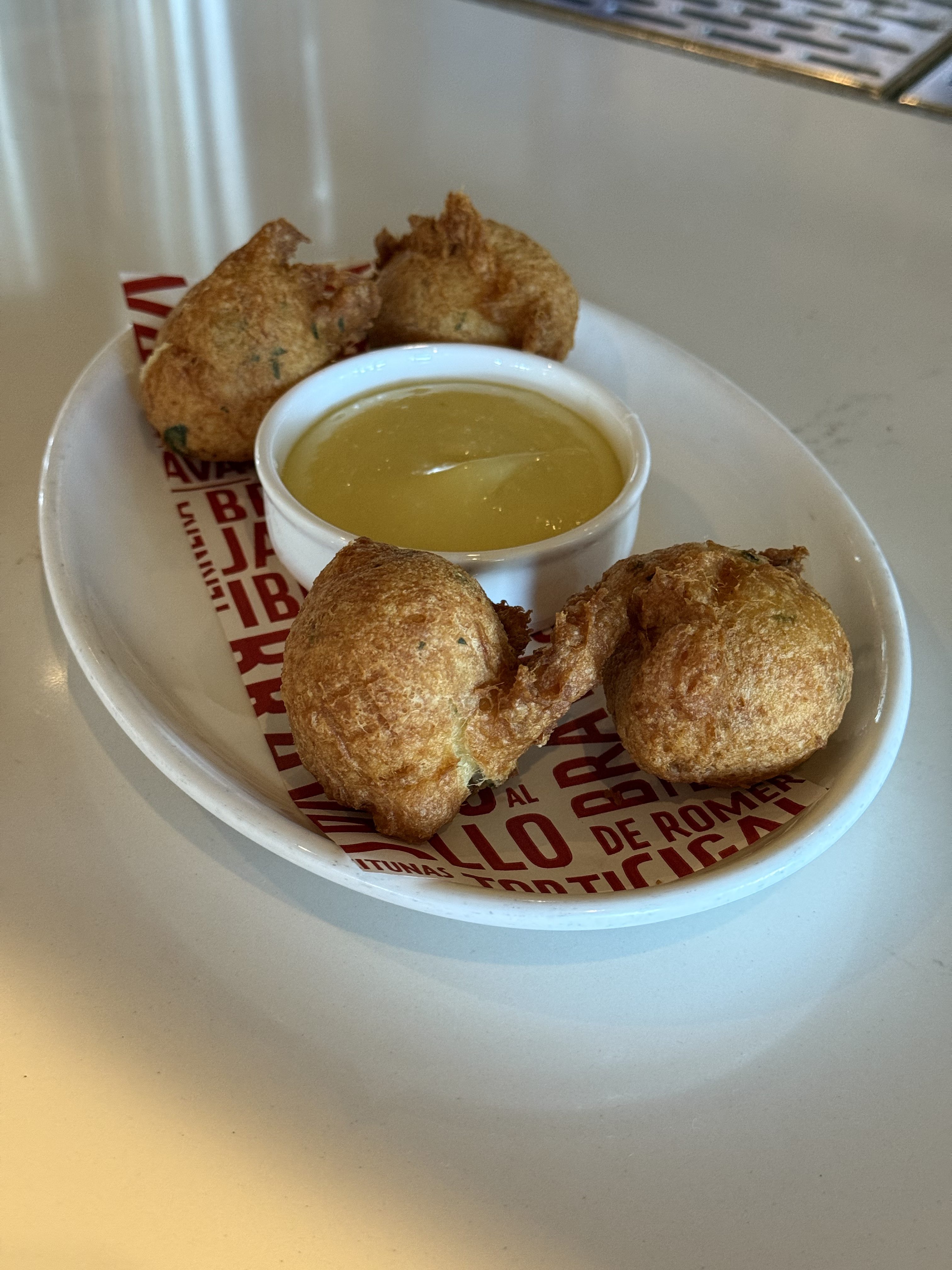 Bunuelos de bacalao con aioli de miel – Fried Cod and Potato Fritters with Honey Aioli – $6.50