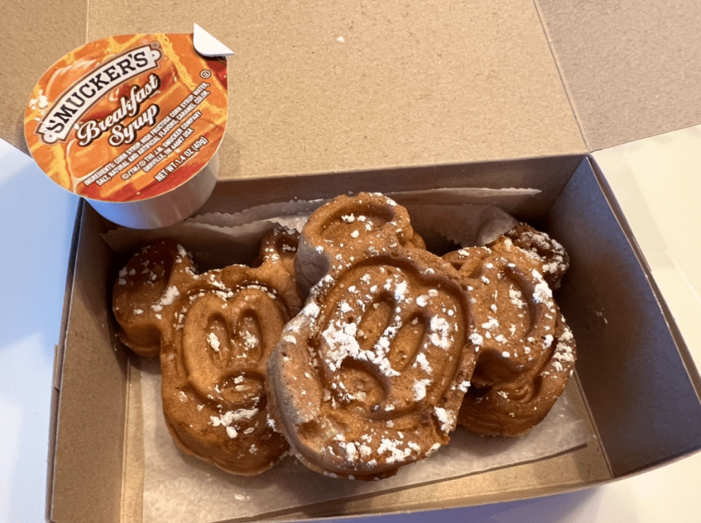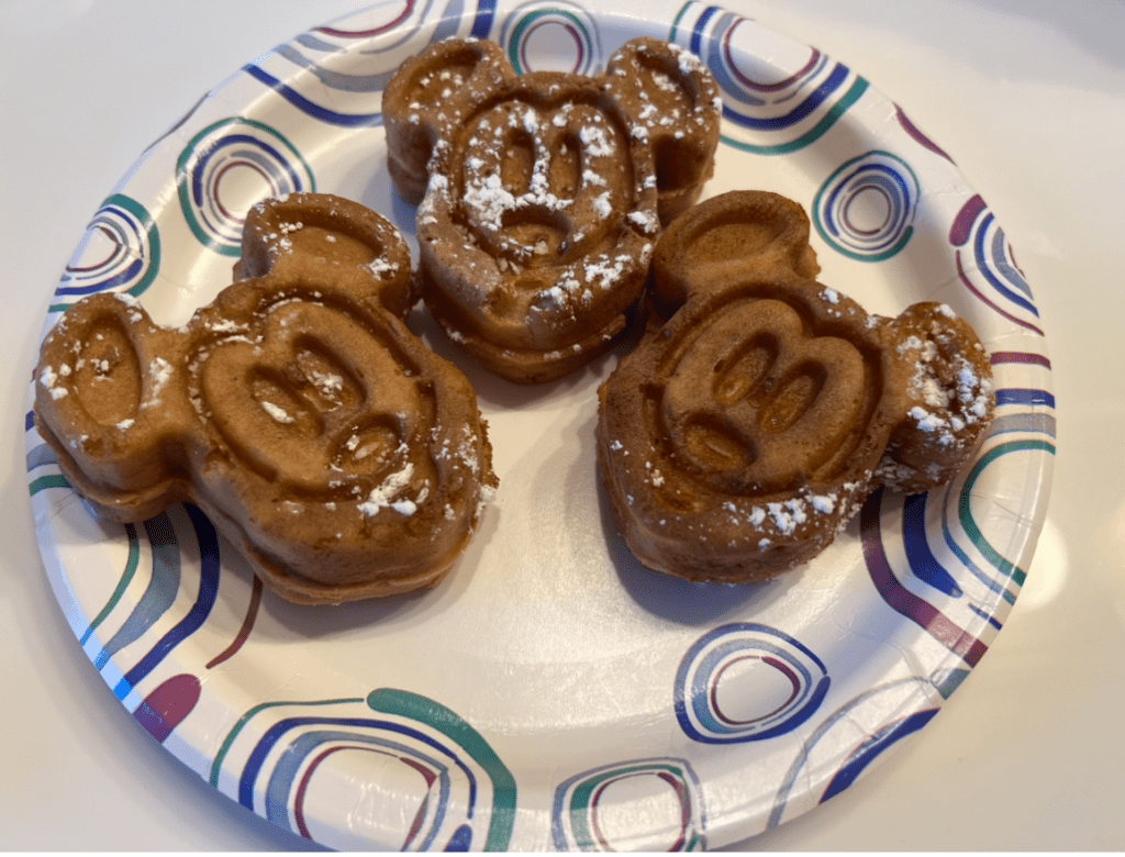 These were a little cheaper than the Mickey Waffles you get at the Disney resort quick service restaurants (which cost $3.00+ more), however the Disney resort ones come with a side of either bacon or sausage. Other than that they didn’t compare well to the Disney waffles. These waffles were overcooked and the flavor was just off. Very disappointing. I gave them a rating of only 2.